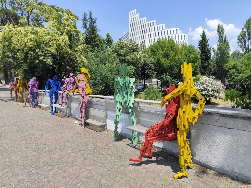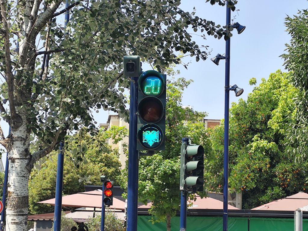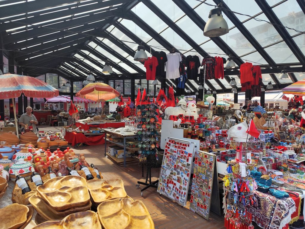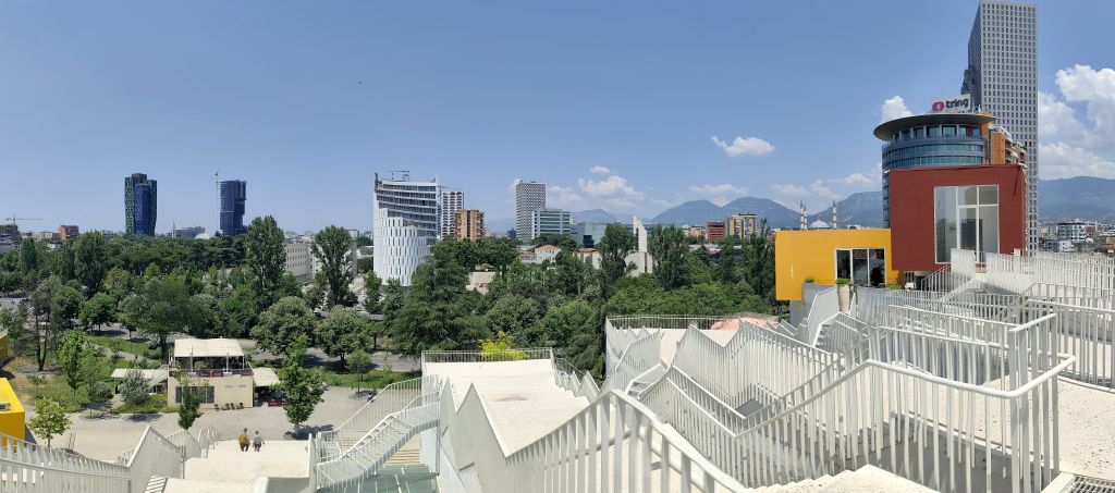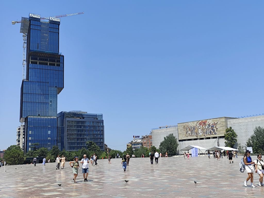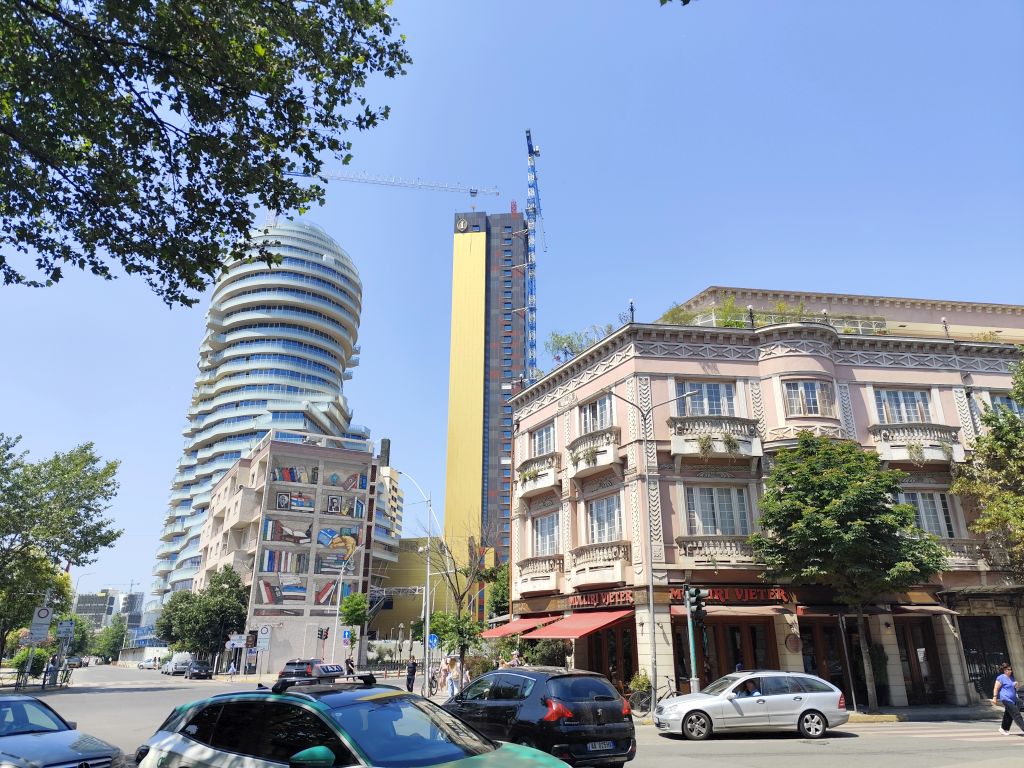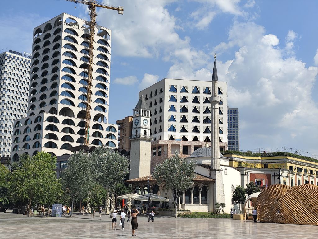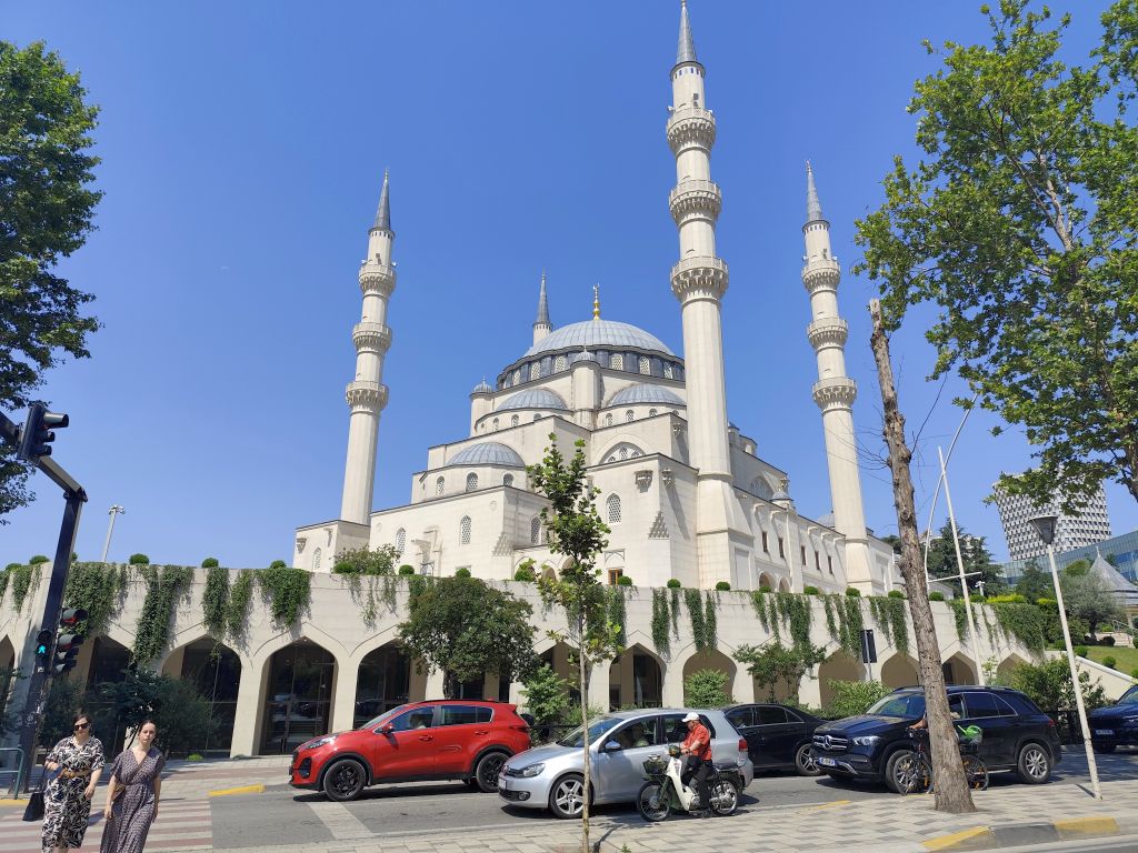 Die Nacht in meiner Einzelkabine war sehr gut, ausser dass ich ständig auf die Toilette musste, wegen dem vielen Wasser, das ich getrunken habe. Statt Frühstück ein Kaffee. Und schon wird zum Aufbruch geblasen, ich bin einer der ersten Motorradfahrer, der aus dem Schiff herausfährt und der erste, der durch den Zoll kommt. Die Fahrt nach Tirana ist Autobahn, 63km, ereignislos und rasch erledigt. Einmal muss ich anhalten, da sich so viel Staub auf den Instrumenten abgesetzt hat, dass ich sie nicht mehr ablesen kann. In Tirana kämpfe ich mich durch den völlig chaotischen Verkehr – Grünphasen sind nur Empfehlungen, jeder macht, was ihm passt, Autos werden mitten auf der Strasse stehen gelassen. Meine Unterkunft, das Mandarin Hostel, ist zwar wirklich völlig zentral gelegen, hat aber trotzdem einen grossen Innenhof, wo ich das Motorrad abstellen kann. Der Schlafsaal ist klimatisiert. Ich laufe in die Stadt, die seit meinem letzten Besuch völlig verändert ist. Ueberall schiessen originelle Hochhäuser hoch, es sehr viel Pärke und Alleen gegeben, viele Strassen haben Namen bekommen und sind sogar angeschrieben. Auch die Autos sind jetzt ganz modern, die Taxis alle elektrisch, man spürt den Wohlstand. Die Fussgängerampeln zeigen albanische Doppeladler an. Ich gelange zum Skenderbeg-Platz und dann zur grossen Moschee (Namazgja-Moschee), die ich besuche. Sie hat ein überzeugendes Farbkonzept im Inneren. Ueber eine künstlerisch verzierte Brücke gelange ich zur Pyramide, die bei meinem letzten Besuch eine jämmerliche Ruine war. Sie gilt als Wahrzeichen von Tirana. Jetzt ist sie gar nicht mehr wiederzuerkennen, ein Teil davon wurde überbaut, der Rest mit Treppen versehen. Von der Spitze aus hat man eine schöne Sicht auf das Stadtzentrum. Im Inneren wurde ein bis jetzt kaum ausgemietetes Ladenzentrum eingerichtet. Bei der Touristeninformation hole ich mir einen Stadtplan. Noch einmal gelange ich zum Skenderbeg-Platz. Ein Einkauf bei Conad zeigt, dass dieser mehr als doppelt so teuer wie in Italien ist. Ich kehre zurück zum Hostel, wo ich den wasserdichten Rucksack hole und einen Schuhmacher für die Reparatur suche. Aber einen solchen scheint es hier nicht zu geben. Das einzige Geschäft, das in Frage kommen könnte, hat zu. Zwar ruft eine nette Passantin den Mann an, er kommt kurz, aber nur, um mir zu erklären, dass „Maschine kaputt“. Ich solle morgen wieder kommen. Hoffentlich klappt es. Auch die weitere Suche nach einem Schuhmacher bleibt erfolglos. Dafür kaufe ich Gemüse und Fetakäse für einen griechischen Salat. Ich würge diesen hinunter und plaudere mit der Receptionistin, die auch viel gereist ist. Viel lieber hätte ich ein leckeres Börek gegessen.