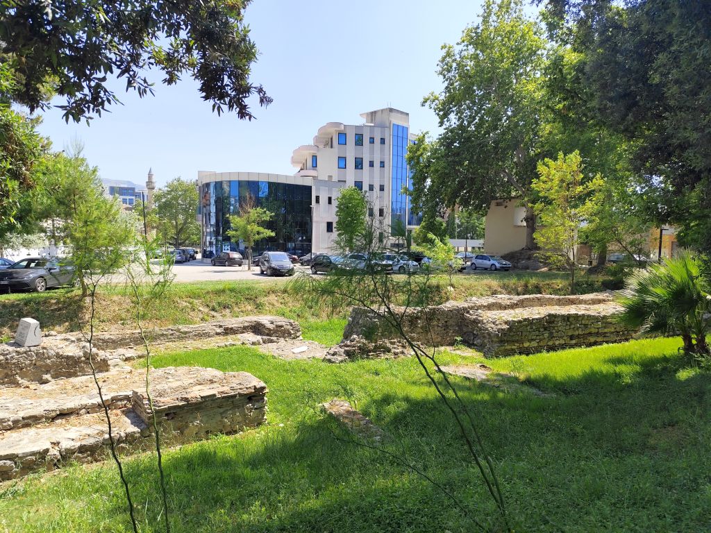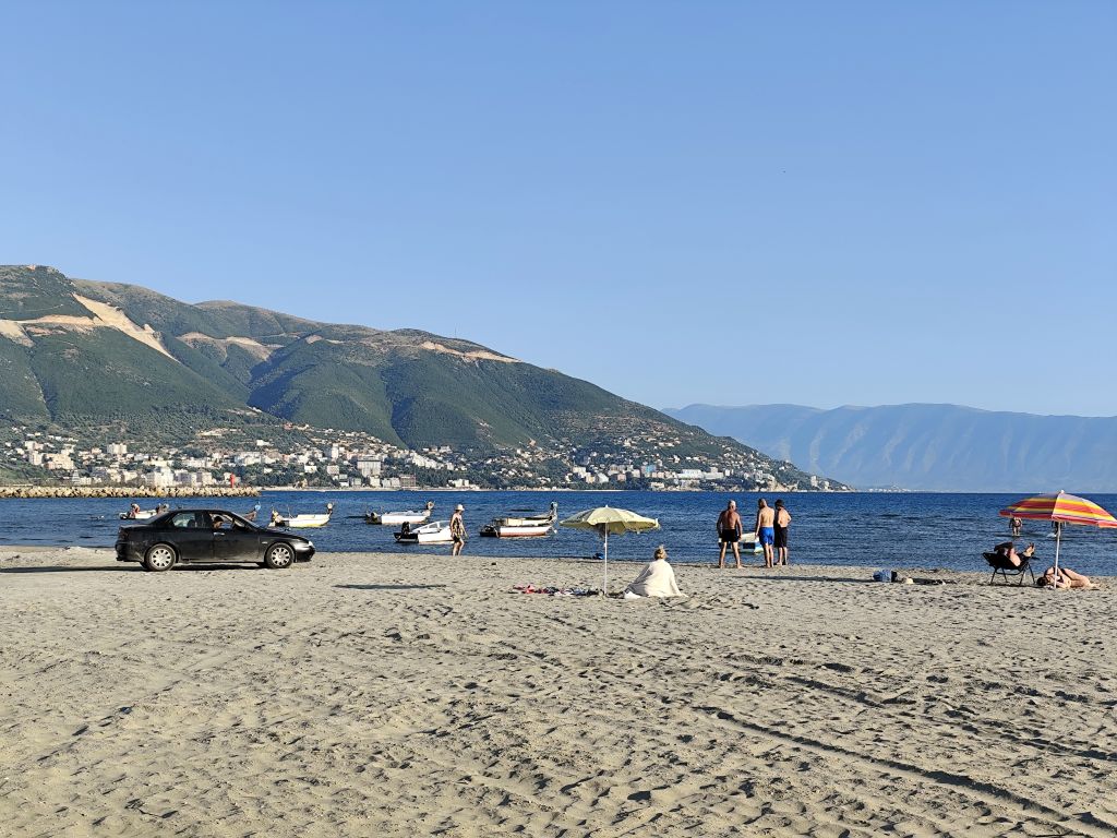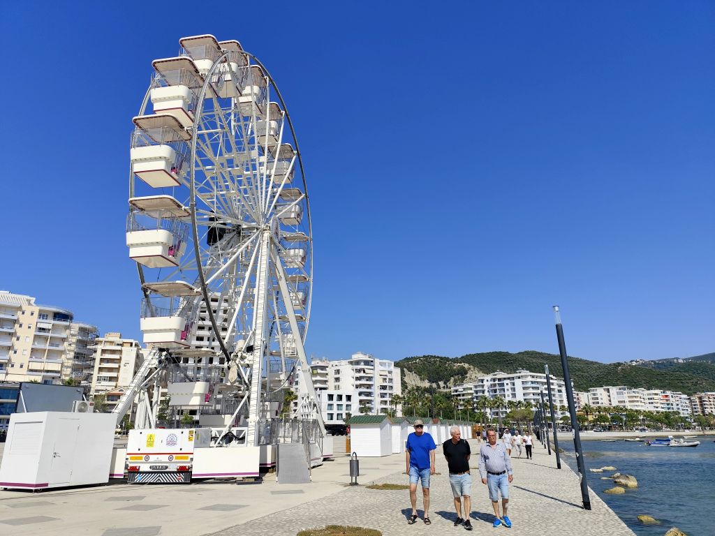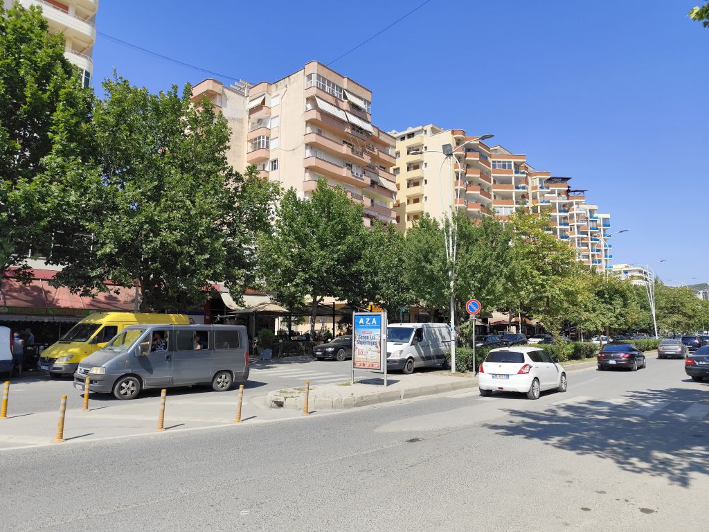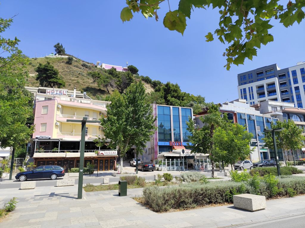Ich muss mich nicht besonders beeilen, mache mich aber doch recht früh am Morgen fertig zur Abfahrt. Ich komme sehr gut durch die Innenstadt durch, doch in der Ausfallstrasse Richtung Durres ist ein Riesenstau wegen Verkehrsüberlastung. Ich kämpfe mich durch (zwischen den Fahrzeugkolonnen) und schliesslich geht es zügiger weiter. Die Strasse ist diesmal miserabel, es hat überall Flicken und Schlaglöcher. Kurz vor Pezë e Vogël fällt mir ein unglaublich prunkvoller Palast auf, den sich wohl ein Exilalbaner hingebaut hat. In Durres muss ich nachtanken. Der Tankwart hat keinerlei Münzen, ich denke, er will mich betrügen, aber später muss ich feststellen, dass es ausserhalb Tiranas keine Münzen gibt und der kleinste Schein ist 200 Lek (2 Euro). Eine blöde Situation. Ab Durres ist es rund 60km Autobahn, auf die ich eigentlich gar nicht dürfte, denn die Albaner haben die Verbotsschilder 1:1 von den Italienern übernommen. Um die Mittagszeit komme ich im Hotel „Kapsul“ in Vlorë an und tatsächlich ist es ein Kapselhotel. Ich checke ein und laufe in die Stadt. Diese kommt mir diesmal noch hässlicher als das letzte Mal vor, wie in Marbella riesige Wohnblöcke am Meeresufer, eine Verkehrsmoloch, der sich durch die Strassen zwängt, Preise doppelt so hoch wie in Tirana und nirgends Schatten. In einem Restaurant bestelle ich „Padina“, aber es ist nicht dasselbe wie in Tirana, hier kriege ich eine Omelette mit etwas Aufschnitt und Käse drin. Ungünstig. Trotzdem laufe ich die zwei Kilometer in die etwas im Landesinneren gelegene Altstadt, die aber, mit Ausnahme der hübschen und stets geschlossenen Muradie-Moschee, wenig zu bieten hat. Ruinen von alten Wohnhäusern, ohne Dach, Türen und Fenster, dazwischen moderne Bauten. Ich bestelle einen „Souvlaqe“ und erhalte den grössten, den ich je gegessen habe. Im Stadtpark unter den Bäumen und neben den Denkmälern verzehre ich ihn, dann laufe ich wieder zurück, diesmal einen anderen Weg. Ich besuche noch die Marina, die noch im Bau ist, sowie den Lungomare mit dem (temporär dort stationierten) Riesenrad, aber all dies interessiert mich wenig. So kehre ich ins Hostel zurück, lese etwas, nicke immer wieder ein, so dass der Receptionist, der es auf dem Bildschirm gesehen hat, sich Sorgen um meine Gesundheit macht. Wahrscheinlich sehe ich wie gestorben aus. Um sieben Uhr laufe ich nochmals ins Zentrum, kaufe etwas Käse und möchte nahe des Hostels ein Brötchen dafür kaufen, aber die Bäckerei hat nur riesige Weissbrote. So muss ich nochmals zurück ins Stadtzentrum, wo eine andere Filiale derselben Bäckerei noch einen ganzen Sack davon hat. Ich esse mein Käsebrot im Schatten hinter der Universität und kehre dann ins Hostel zurück.