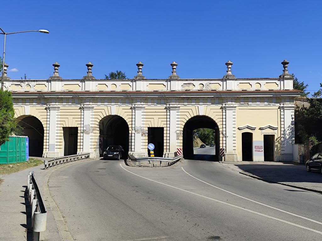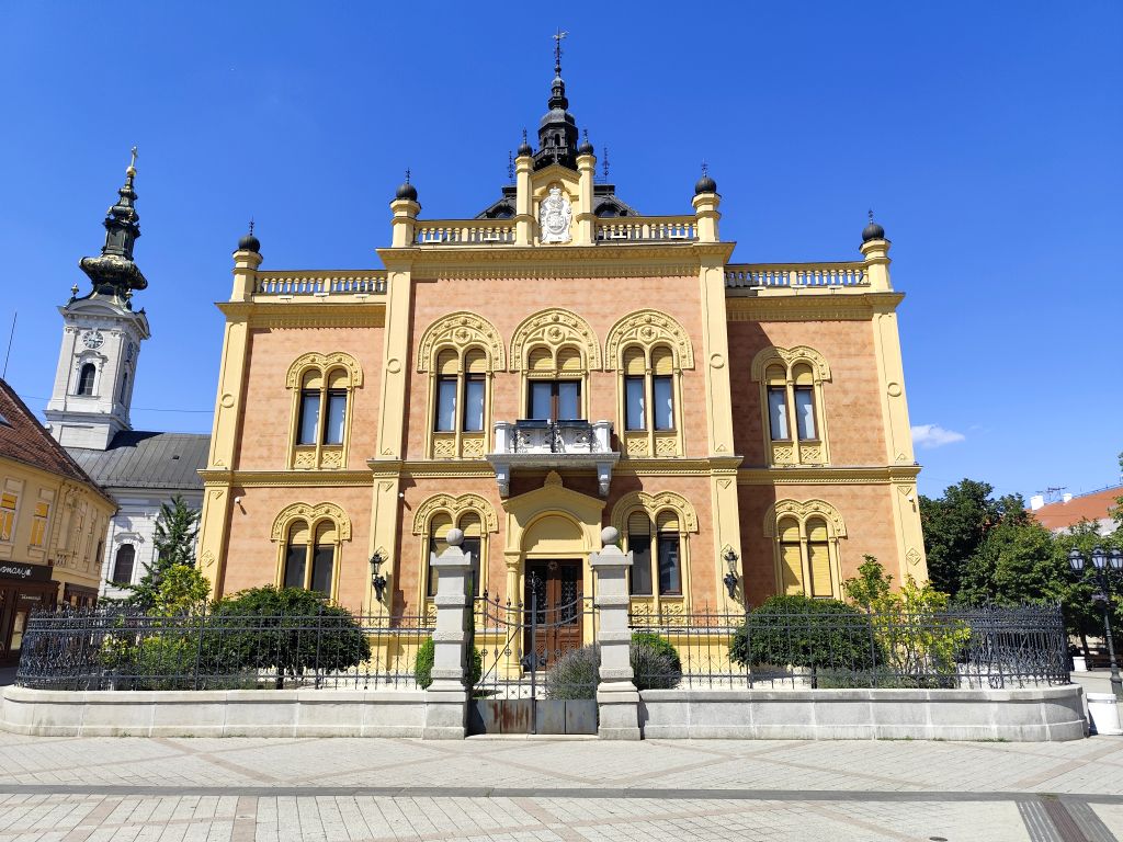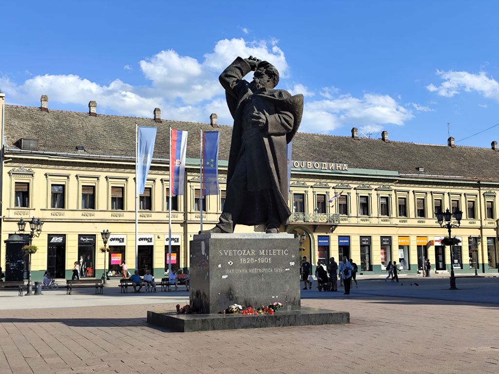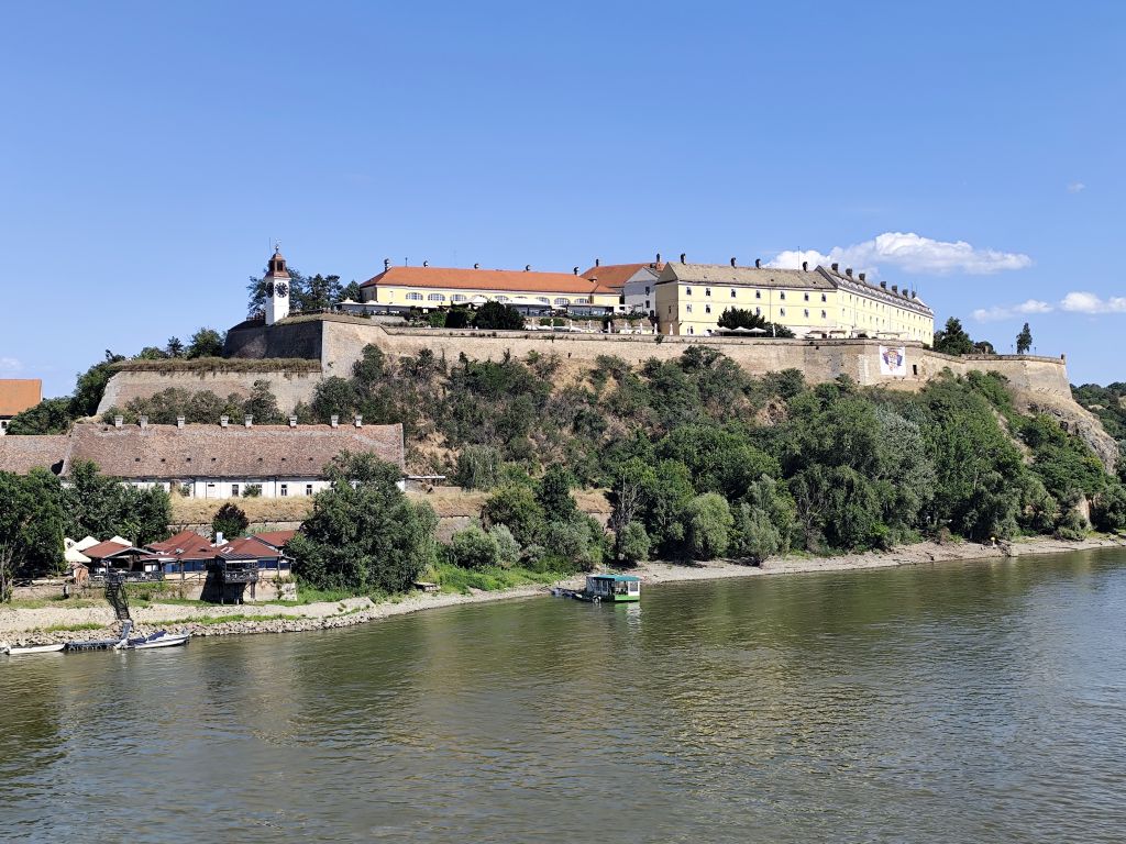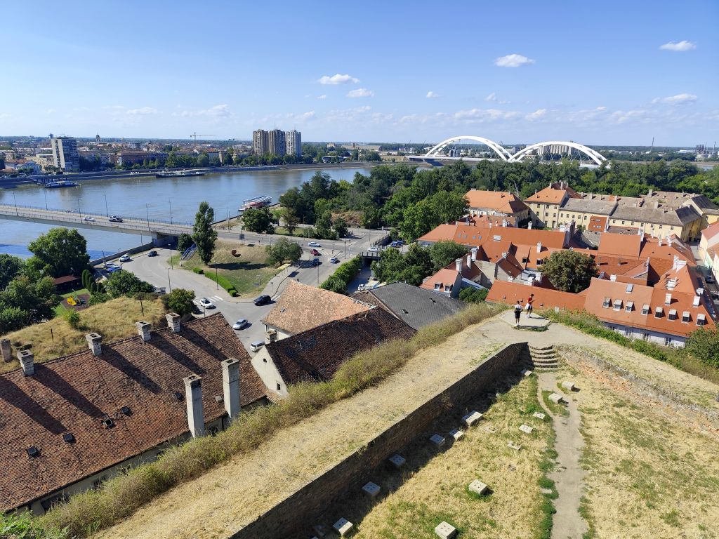 Bis 09:45 bummle ich, denn das Muzeul Satului Banatean öffnet erst um 10 Uhr und ich sollte nicht vor 14 Uhr im nur 150km entfernten Novi Sad eintreffen. Ich lese, schaue Youtube und fahre dann los. So bin ich der erste Besucher heute. Das Museum hat eine Vielzahl von ländlichen Häusern aus dem ganzen Banat. Besonders eindrucksvoll ist das Haus von Bata mit seinem Grasdach, das Haus von Capalnas mit meinem bemoosten Schindeldach, das ukrainische Haus oder das Haus der Deportierten von Baragan (eine schreckliche Geschichte aus dem Kommunismus, die Leute wurden eingesammelt, mit ihrem Hausrat auf einem Feld abgesetzt und sich selbst überlassen). Nun mache ich mich auf den Weg nach Novi Sad. Das Wetter ist wieder schön und warm geworden. In Jimbolia verwende ich meine letzten Lei, um im Lidl Brötli und Hummus zu kaufen. Dann will ich über die Grenze nach Serbien. Aber die rumänischen Behörden können niemanden abfertigen, deren EDV ist abgestürzt. Ich warte eine halbe Stunde, bis sie wieder weitermachen – immer noch besser, als wenn sie die Grenze ganz geschlossen hätten. Endlich kann ich durch. Viele Motorräder kommen mir entgegen, es scheint ein Motorradtreffen irgendwo in der Nähe von Srpska Crnja zu geben. Zrenjanin umfahre ich. In Serbien ist eine Stunde früher. So komme ich fast pünktlich kurz nach 14 Uhr in „Brodski’s Cat Art Hostel“ an. Ich checke ein, ziehe mich um und laufe sofort in die Stadt. Mein Rundgang umfasst: Trg Republike mit einem Denkmal für König Petar Karadjordjevic, orthodoxer Bischofspalast, Trg Slobode, Katholische Kathedrale „Name Marias“. Auf dem Tourismusbüro hole ich mir einen Stadtplan und plaudere lange über Autos. Weiter geht es mit Dunavski Park, Varadinska Duga Brücke, mit der ich zur Festung Petrovaradin gelange. Dort besuche ich das Geburtshaus von Ban Josip Jelacic, das Belgrader Tor, die (zerfallende) Kirche St. Georg, vor der gerade ein Brautpaar Fotos macht, den Uhrenturm oben auf der Festung, die Festungsterrasse, das Leopoldstor. Dann geht es wieder in die Stadt hinein, diesmal zur Synagoge. Das Gebäude ist riesig, imposant. Leider kann man nicht hinein. Unweit davon ist die reformierte Kirche und das serbische Nationaltheater. Beim Zurücklaufen leiste ich mir einen erstaunlich teuren Gyros in einem der kleinen Restaurants in der Altstadt.