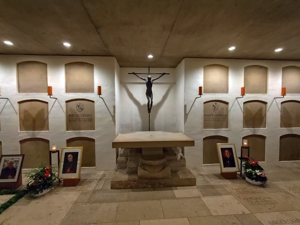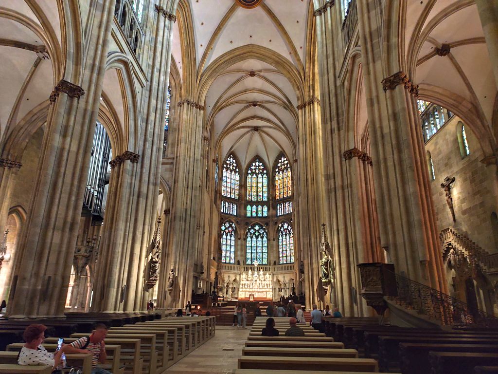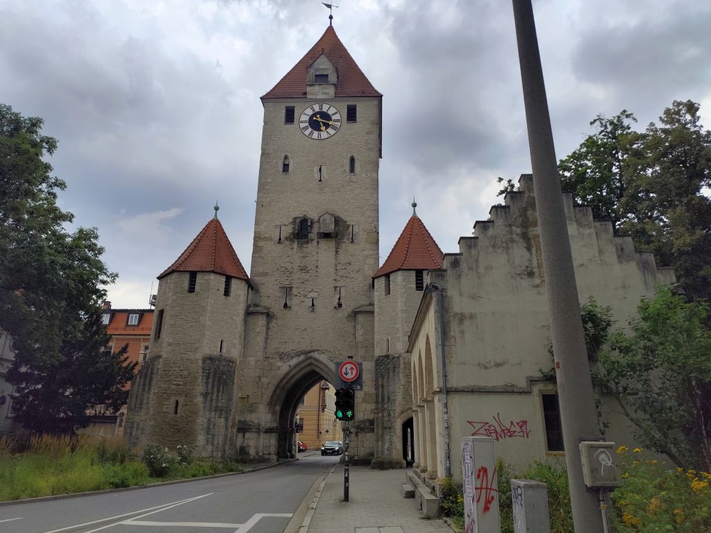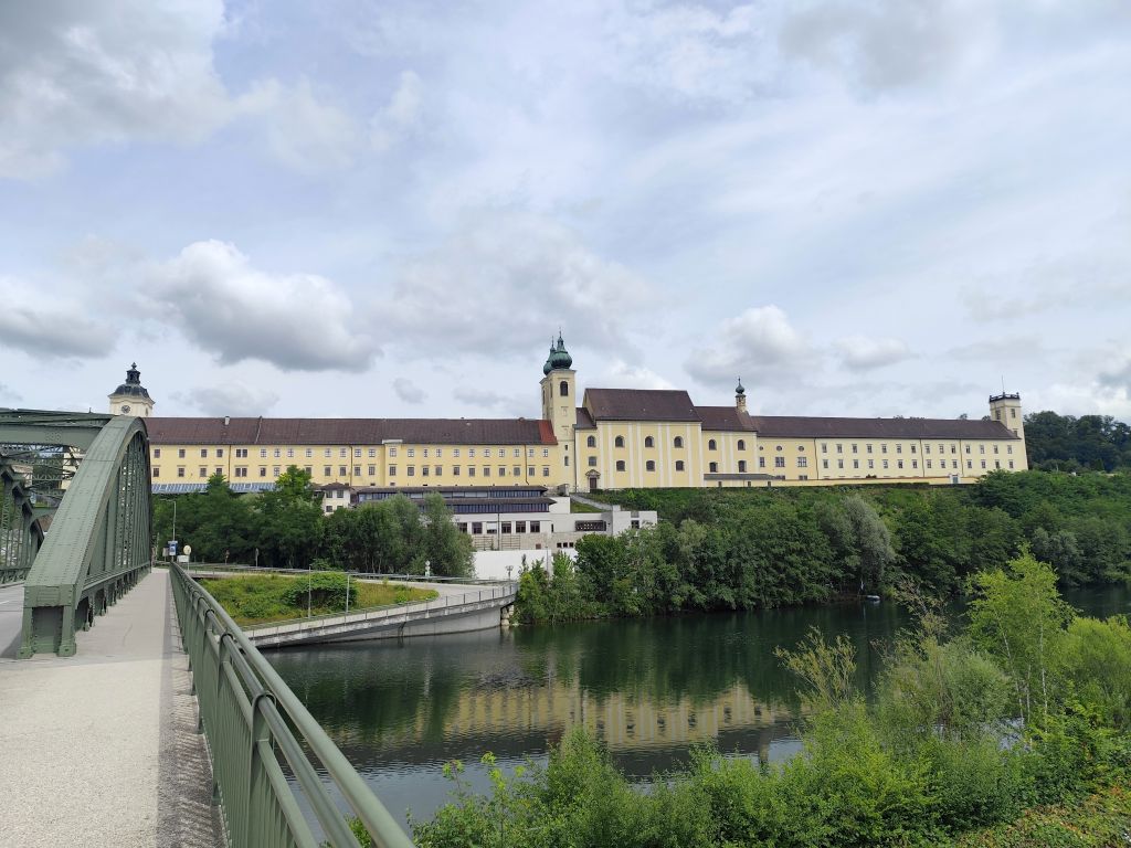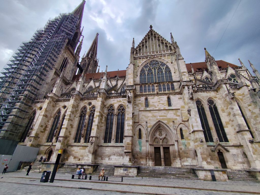 Ich ziehe mich warm an, denn der Wetterbericht ist schlecht. Meine Gastgeberin lässt es sich nicht nehmen, obwohl ich kein Frühstück bestellt habe, mir noch Kaffee, ein Brötchen und ein weiches Ei zu servieren. So verwöhnt werde ich selten. Ich verabschiede mich von ihr und fahre los. Der Himmel ist schon ein wenig bedeckt, aber ab und zu kommt die Sonne hervor. Als ich durch Liezen durch bin und schon am Pyhrnpass, schaue ich auf mein Telefon und sehe, dass meine Gastgeberin angerufen hat. Ich rufe zurück und sie sagt mir, der Zimmerschlüssel müsse noch irgendwo bei mir sein. So durchsuche ich mein Gepäck und finde ihn tatsächlich in einer Jackentasche. Ich kehre um und fahre die 28km zurück nach Trieben, wo ich den Schlüssel abgebe. Eine gute Stunde ist vergangen, dann bin ich wieder am Pyhrnpass. Unterdessen hat sich der Himmel etwas stärker bedeckt. Auf der anderen Seite halte ich in Spital am Pyhrn und bewundere die riesige Stiftskirche. Die Fahrt durch den Nationalpark Kalkalpen ist wunderschön. Einen weiteren kurzen Halt mache ich in Lambach, wo das Stift in grosser Länge das Ufer der Traun belegt. Ueber kleinste Strässchen, allerdings alle geteert, geht es jetzt querfeldein. Ich zweifle bereits daran, ob mein Navi noch richtig funktioniert. Irgendwo halte ich dann und esse mein mitgebrachtes Mittagessen. Die letzten 45 km vor der deutschen Grenze gehen zügig vonstatten. Nach der Grenze gibt es die schnellen deutschen Strassen, wo man durchwegs mit 80-100 km/h fahren kann. In Osterhofen tanke ich nach, finde im Edeka endlich die kleinen Milchpackungen und bei Netto eine kleine Kaffeedose. Leider ist die direkte Strasse nach Regensburg gesperrt. Ich fahre die Umleitung, was zirka 50 Kilometer gut geht, dann ist auch diese gesperrt. Jetzt geht es in die Umleitung der Umleitung. Die Restdistanz auf meinem Navi steigt ständig, anstatt dass sie fällt. Schliesslich gebe ich die ausgeschilderte Umleitung auf und folge dem Navi. Der Himmel ist unterdessen mit schwarzen Gewitterwolken bedeckt und ich pressiere, um noch rechtzeitig vor dem Gewitter anzukommen. Um 17 Uhr, eine Stunde später als geplant, komme ich im „Hostel am Ostentor“ an. Das Hostel macht auf Anhieb einen sehr guten Eindruck, sehr sauber und organisiert. Ich checke ein, dann schnappe ich mir den Schirm und laufe zum Dom. Dieser ist innen völlig dunkel, nur der Altar und ein paar Seitenkapellen sind beleuchtet. In der Krypta gibt es eine Bischofsgruft mit noch vielen leeren Plätzen. Auch die Gebeine von Berthold von Regensburg sind, schön nach Grösse sortiert und unter einer Glasscheibe, dort ausgestellt. Ich gehe noch einkaufen – ab heute werde ich, wie gestern in den Videos gesehen, eine Haferflockenkur machen, damit mein Diabetes besser wird. Als ich aus dem Rewe herauskomme, geht ein Gewitterregen nieder. Ich warte lange, doch als es nicht besser wird, laufe ich mit dem Schirm zurück ins Hostel. Klar, dass meine Schuhe jetzt völlig durchnässt sind.
