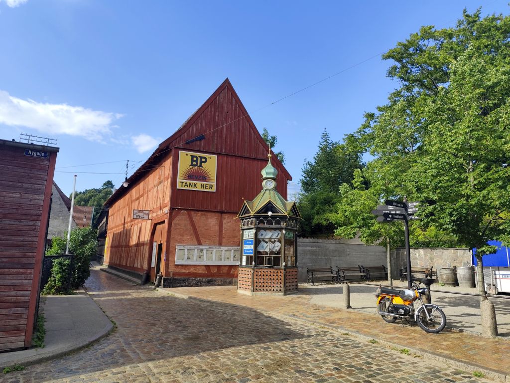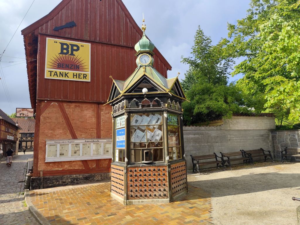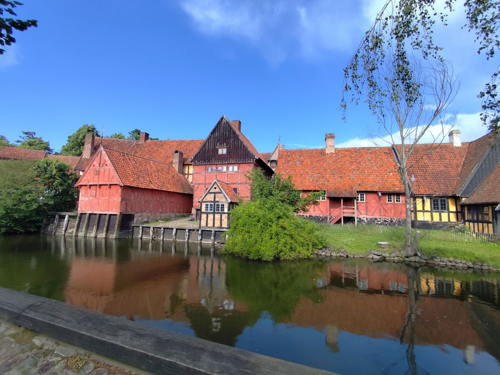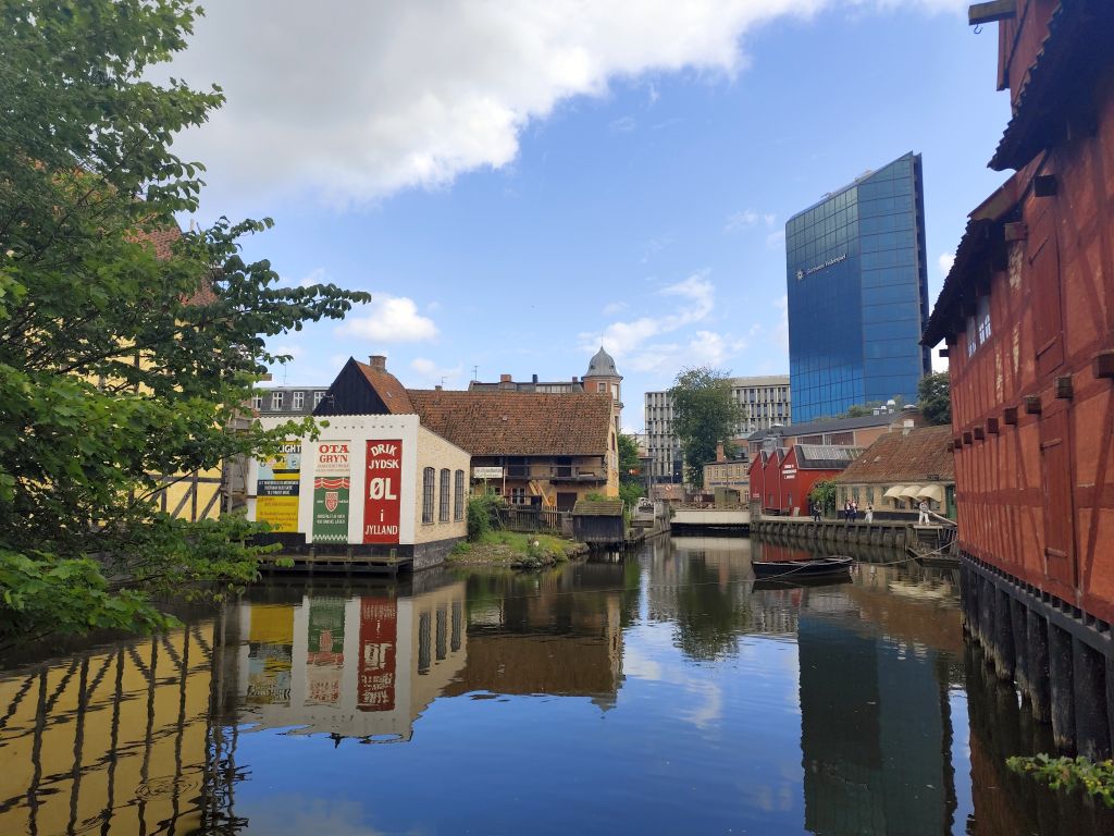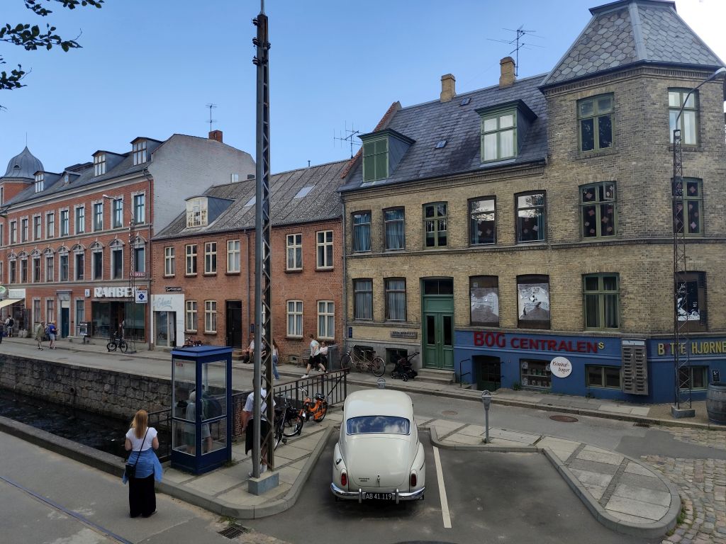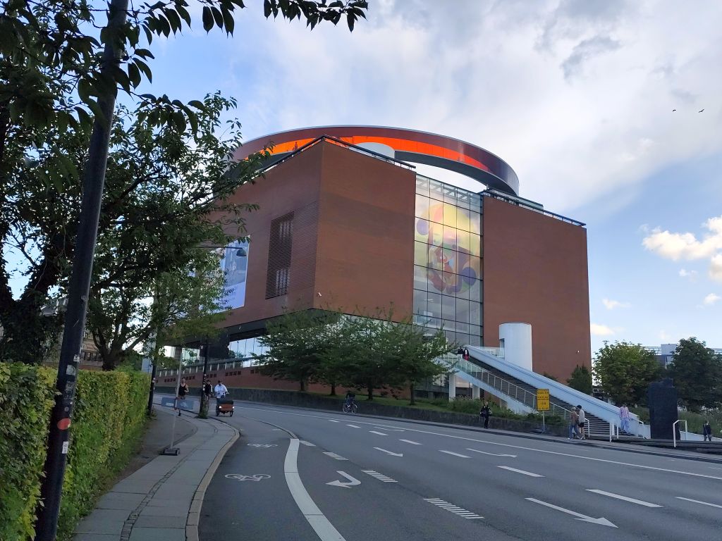 Als ich in Kiel abfahre, ist der Himmel mit dunklen Wolken bedeckt. Nachtanken in Oeversee. In Flensburg kaufe ich mir einen Znüni, da ist es noch trocken, doch als ich weiterfahre, ist eine schwarze Wand vor mir. Ich ziehe unter einer Brücke das Regenzeug an, gerade noch rechtzeitig, da ich in einen prasselnden Gewitterregen gerate. Nach einem Kilometer oder zwei ist wieder gut, es blinzelt sogar die Sonne zwischen den Regenwolken hindurch. Es geht so weiter: Regen, Sonne, Regen. Das Regenzeug behalte ich an. Die Grenze nach Dänemark ist kein Problem, es gibt keine Kontrollen. In Kolding muss ich nochmals nachtanken. In Vejle halte ich kurz bei einer Windmühle. In Horsens halte ich bei einem Supermarkt und kaufe mir den einzigen ungezuckerten Joghurt, den es hat, einen teuren griechischen Joghurt. Er hat die Konsistenz von Teppichkleber. Schliesslich komme ich nach Aarhus zu „Roberta’s Society“. Erstaunlicherweise ist das ein riesiger Neubau, mit einem Hostel und Bar und Restaurant. Natürlich keine Gästeküche und auch keinen Aufenthaltsraum. Ich checke ein. Als ich den Scooter parkieren will, der Schock: Scooter müssen kostenpflichtig parkiert werden und kosten dasselbe wie ein Auto. Und das ist absurd viel. Vor dem Hostel müsste ich 165 DKK bezahlen. Ich stelle den Scooter über einen Kilometer vom Hostel entfernt ab, wo es etwas billiger ist, nämlich 100 DKK (ca. CHF 15.00). Da gleich daneben das Freilichtmuseum „Den Gamle By“ ist, will ich einen Eintritt kaufen. Der kostet allerdings tatsächlich DKK 205, also rund 30 Franken! Viele der Häuser kann man betreten und sie sind innen mit Wohnungen aus unterschiedlichen Zeitperioden ausgestattet, so die Wohnung einer Schulleiterin aus den 1930er Jahren, die Wohnung einer WG aus den 1970er Jahren, die Wohnung einer Patchworkfamilie aus den 2000er Jahren, dann hat es eine Arztpraxis von 1974, eine Töffliwerkstatt aus den 1970er Jahren. In anderen Gebäuden hat es ein Jazzlokal, eine Autogarage aus den 1930er Jahren, eine Zeitungsdruckerei aus der Jahrhundertwende, eine Färberei aus dem 19. Jahrhundert, eine Mühle von 1843, etc. Weiter hat es ein Plakatmuseum, ein Silberwarenmuseum, ein Uhrenmuseum, ein Schmuckmuseum und ein Museum der Geschichte von Aarhus seit der Wikingerzeit. Um fünf Uhr werde ich aus der Wohnung, die ich gerade besichtige, herausgeschmissen, es werde geschlossen. Ich besichtige nun den Aussenbereich. Immer wieder kurze, heftige Regengüsse. Ich verlasse das Museum erst um halb sechs Uhr. Nun erkunde ich noch kurz die Altstadt. Es regnet nun ständig. Ich laufe durch die Studentenbeizen der Vestergade, schaue mir die Backstein-Kathedrale wenigstens von aussen an, laufe zu den Kais, zum Toldboden. Sehe die Hafenkräne auf Mellemarmen. Auf dem Bispetorvet hat es eine kokonförmige Bar. Ich erkunde die Fressmeile Åboulevarden direkt am Aarhus Å Kanal. Für das Nachtessen will ich nur noch minimale Kohlenhydrate aufnehmen, so kaufe ich Fishcakes und ein ganz kleines Brötli. Die Fishcakes schmecken genau gleich wie gefilte Fisch. Drei esse ich, den vierten verfüttere ich den Möwen, wobei das einen riesigen Streit unter denen auslöst. Zum Abschluss laufe ich zum nahegelegenen ARoS Kunstmuseum, das auf dem Dach einen Rundgang aus farbigem Glas hat.