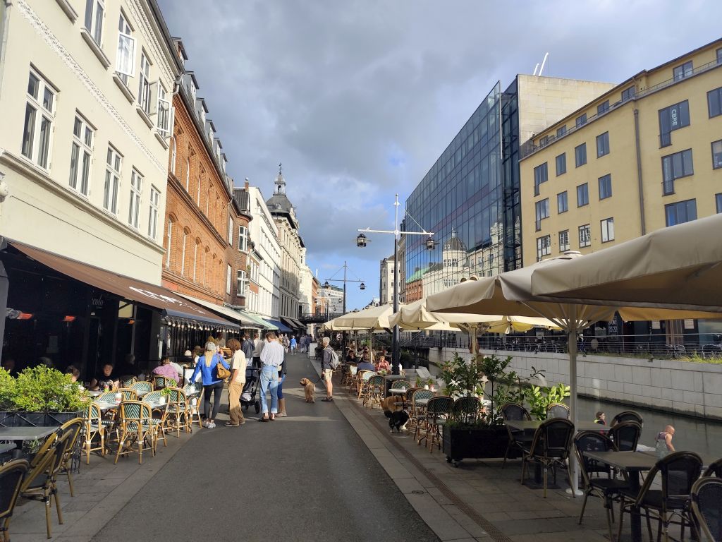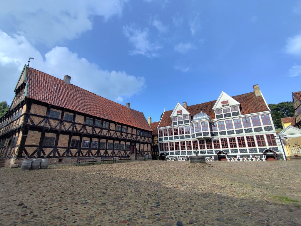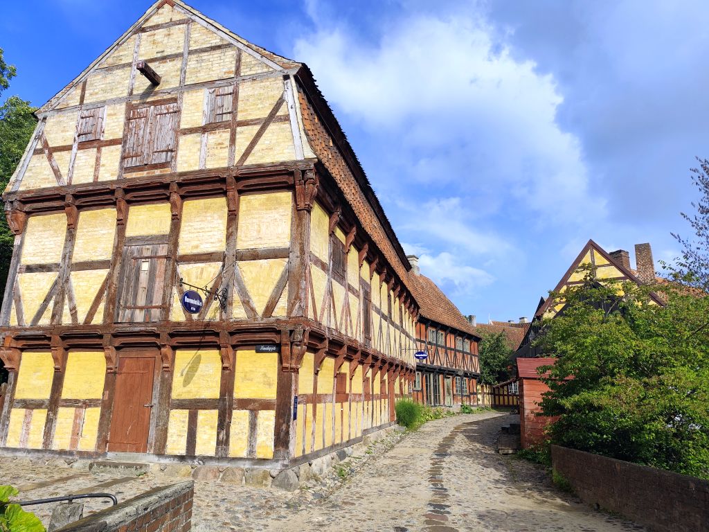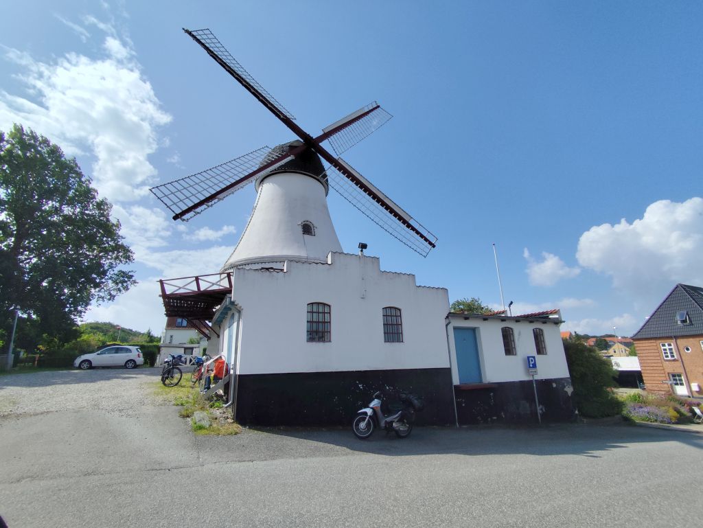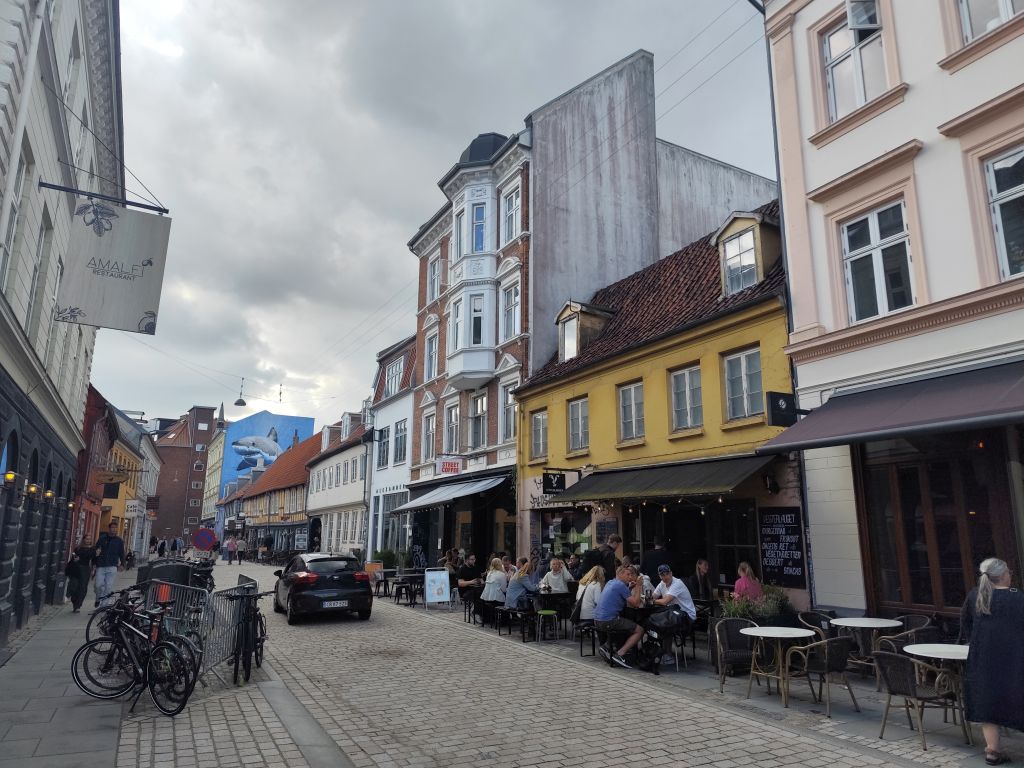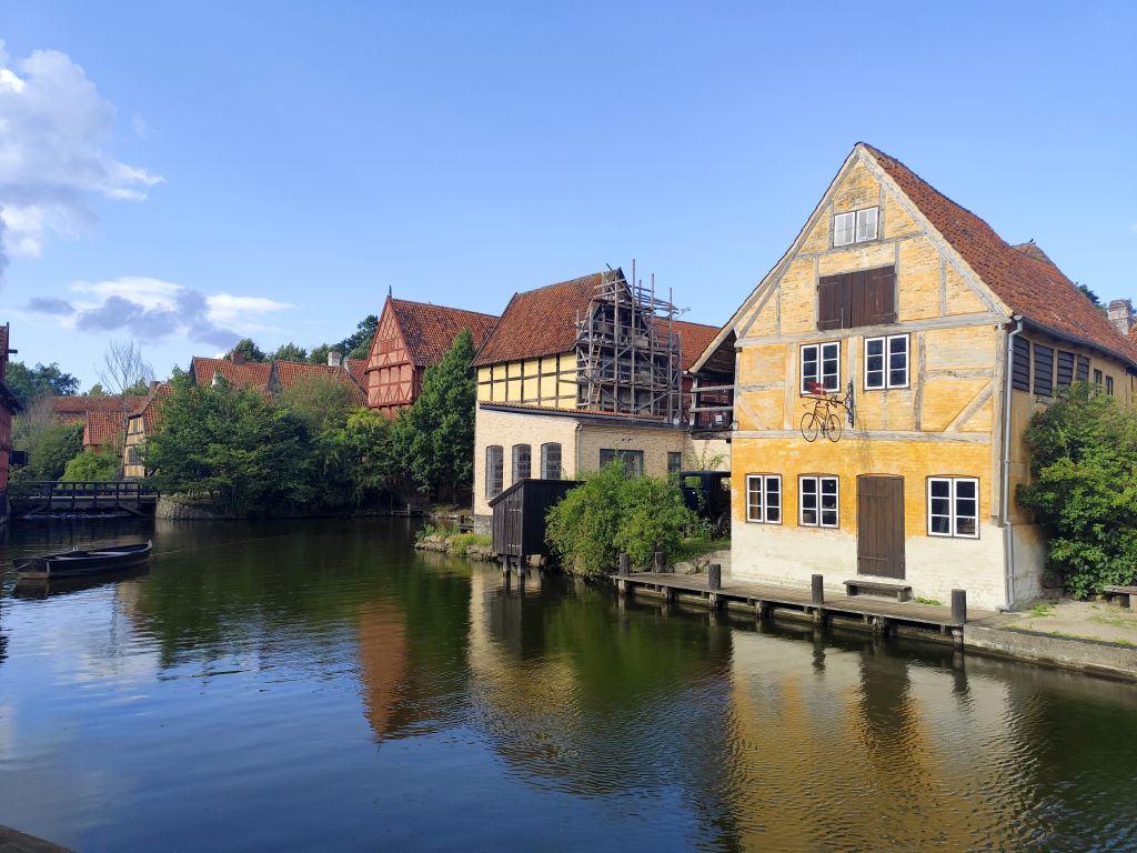 Als ich in Kiel abfahre, ist der Himmel mit dunklen Wolken bedeckt. Nachtanken in Oeversee. In Flensburg kaufe ich mir einen Znüni, da ist es noch trocken, doch als ich weiterfahre, ist eine schwarze Wand vor mir. Ich ziehe unter einer Brücke das Regenzeug an, gerade noch rechtzeitig, da ich in einen prasselnden Gewitterregen gerate. Nach einem Kilometer oder zwei ist wieder gut, es blinzelt sogar die Sonne zwischen den Regenwolken hindurch. Es geht so weiter: Regen, Sonne, Regen. Das Regenzeug behalte ich an. Die Grenze nach Dänemark ist kein Problem, es gibt keine Kontrollen. In Kolding muss ich nochmals nachtanken. In Vejle halte ich kurz bei einer Windmühle. In Horsens halte ich bei einem Supermarkt und kaufe mir den einzigen ungezuckerten Joghurt, den es hat, einen teuren griechischen Joghurt. Er hat die Konsistenz von Teppichkleber. Schliesslich komme ich nach Aarhus zu „Roberta’s Society“. Erstaunlicherweise ist das ein riesiger Neubau, mit einem Hostel und Bar und Restaurant. Natürlich keine Gästeküche und auch keinen Aufenthaltsraum. Ich checke ein. Als ich den Scooter parkieren will, der Schock: Scooter müssen kostenpflichtig parkiert werden und kosten dasselbe wie ein Auto. Und das ist absurd viel. Vor dem Hostel müsste ich 165 DKK bezahlen. Ich stelle den Scooter über einen Kilometer vom Hostel entfernt ab, wo es etwas billiger ist, nämlich 100 DKK (ca. CHF 15.00). Da gleich daneben das Freilichtmuseum „Den Gamle By“ ist, will ich einen Eintritt kaufen. Der kostet allerdings tatsächlich DKK 205, also rund 30 Franken! Viele der Häuser kann man betreten und sie sind innen mit Wohnungen aus unterschiedlichen Zeitperioden ausgestattet, so die Wohnung einer Schulleiterin aus den 1930er Jahren, die Wohnung einer WG aus den 1970er Jahren, die Wohnung einer Patchworkfamilie aus den 2000er Jahren, dann hat es eine Arztpraxis von 1974, eine Töffliwerkstatt aus den 1970er Jahren. In anderen Gebäuden hat es ein Jazzlokal, eine Autogarage aus den 1930er Jahren, eine Zeitungsdruckerei aus der Jahrhundertwende, eine Färberei aus dem 19. Jahrhundert, eine Mühle von 1843, etc. Weiter hat es ein Plakatmuseum, ein Silberwarenmuseum, ein Uhrenmuseum, ein Schmuckmuseum und ein Museum der Geschichte von Aarhus seit der Wikingerzeit. Um fünf Uhr werde ich aus der Wohnung, die ich gerade besichtige, herausgeschmissen, es werde geschlossen. Ich besichtige nun den Aussenbereich. Immer wieder kurze, heftige Regengüsse. Ich verlasse das Museum erst um halb sechs Uhr. Nun erkunde ich noch kurz die Altstadt. Es regnet nun ständig. Ich laufe durch die Studentenbeizen der Vestergade, schaue mir die Backstein-Kathedrale wenigstens von aussen an, laufe zu den Kais, zum Toldboden. Sehe die Hafenkräne auf Mellemarmen. Auf dem Bispetorvet hat es eine kokonförmige Bar. Ich erkunde die Fressmeile Åboulevarden direkt am Aarhus Å Kanal. Für das Nachtessen will ich nur noch minimale Kohlenhydrate aufnehmen, so kaufe ich Fishcakes und ein ganz kleines Brötli. Die Fishcakes schmecken genau gleich wie gefilte Fisch. Drei esse ich, den vierten verfüttere ich den Möwen, wobei das einen riesigen Streit unter denen auslöst. Zum Abschluss laufe ich zum nahegelegenen ARoS Kunstmuseum, das auf dem Dach einen Rundgang aus farbigem Glas hat.