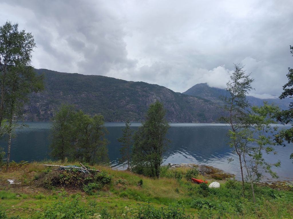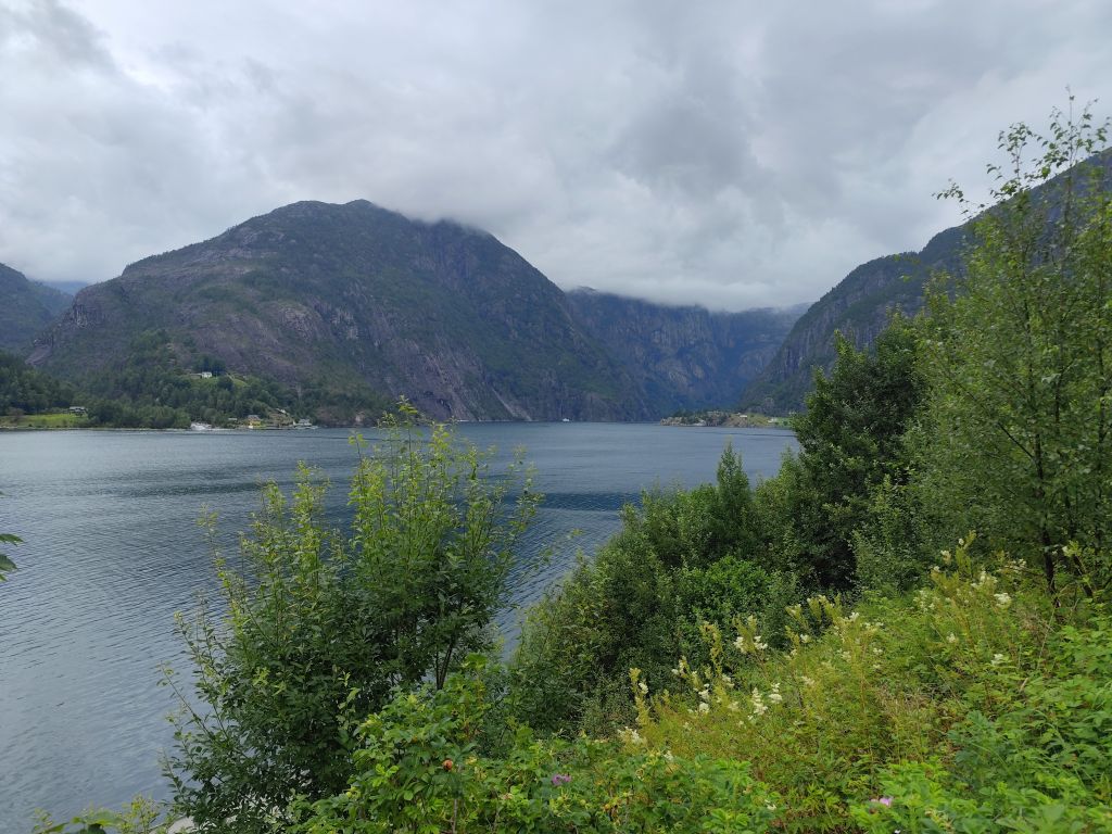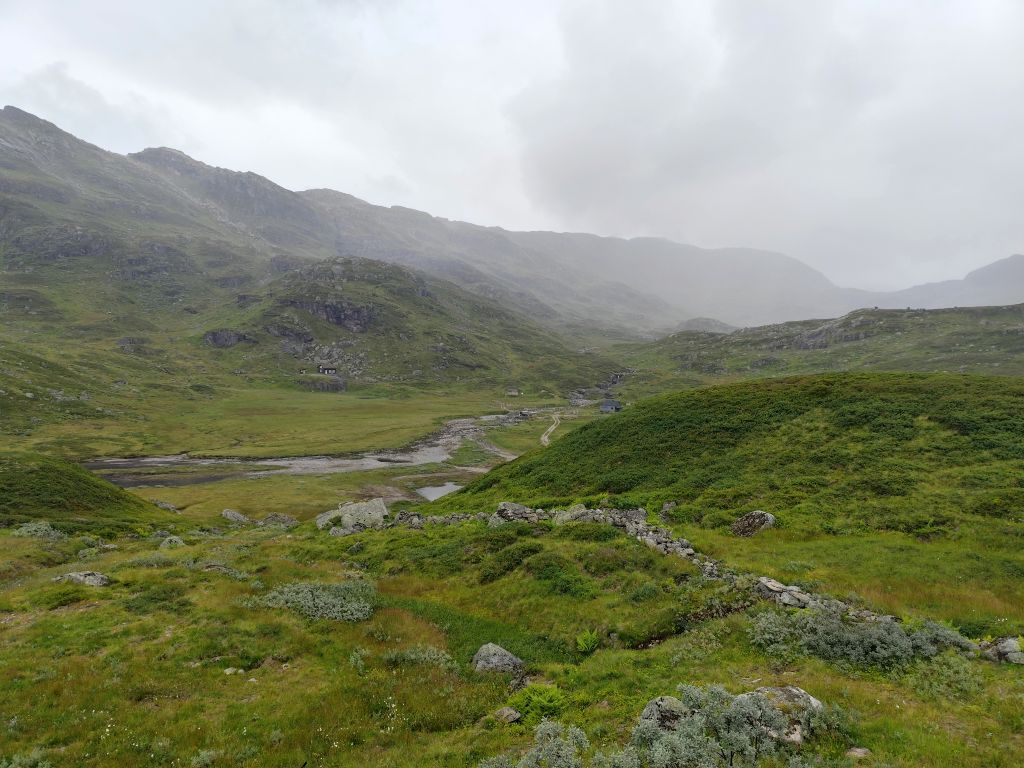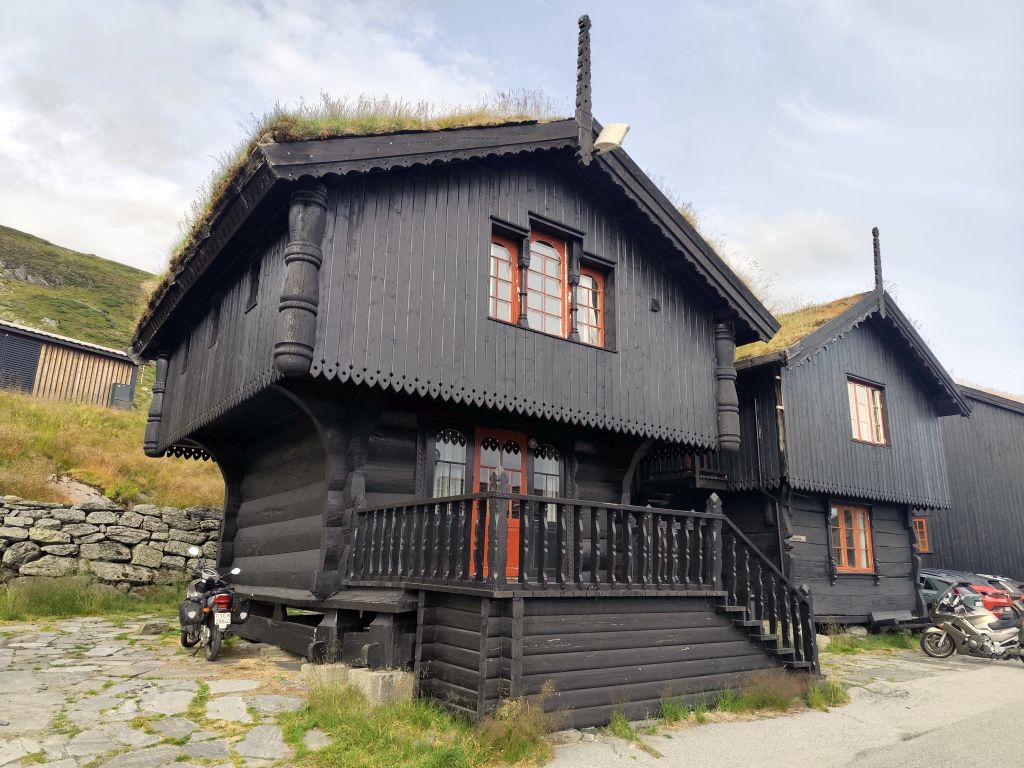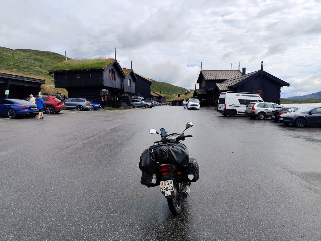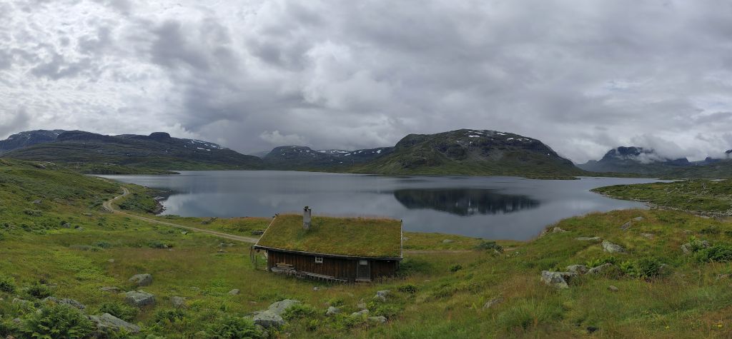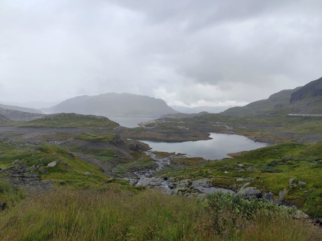 Am Morgen ist der Himmel mit tiefhängenden grauen Wolken bedeckt und es ist in Stavanger noch warm, danach aber sehr kühl. Zweimal geht es mit langen, steilen Tunnels unter einem Fjord hindurch. Ich gelange zur Fähre Mortavika- Asvågen, die ich knapp verpasse, aber jede Viertelstunde fährt ein, so muss ich nicht lange warten, bis die „Boknafjord“ kommt und ich einfahren kann. Das Ticket kann ich auf der Fähre kaufen. Es kostet 55 NOK, das ist sehr bescheiden. Die Fähre ist sehr komfortabel. Ich esse dort eine Omelette zum Znüni. Wir kreuzen mit der Schwesterfähre Raunefjord. In Asvågen fahre ich als erster an Land. In Grinde stoppe ich bei den sieben Menhiren. Es wird geschätzt, dass sie rund um das Jahr 500 gesetzt wurden. In Skjoldastraumen stoppe ich kurz bei dem hübschen Kirchlein, dann fahre ich über die Schleuse und den Damm auf die andere Seite, wo ich kurz die Orientierung verliere, aber bald meinen Weg wieder finde. Danach geht es 134 Kilometer lang auf dem Haukelivegn. Mit flottem Tempo komme ich voran. In Ølensvag halte ich gegenüber einer Werft, die gerade zwei Bohrplattformen dort stehen hat. Beim Langfoss halte ich und bestaune den sehr hohen und wilden Wasserfall. Es geht nun durch zahlreiche Tunnels, der erste, der fast acht Kilometer lange Akrafjordtunnel ist ganz schlecht beleuchtet, so dass ich wahnsinnig aufpassen muss, den Randstein nicht zu treffen. Die übrigen Tunnels sind meist gut beleuchtet. Zweimal geht es durch Kehrtunnels, wie bei der Eisenbahn. Mit dem letzten Tropfen Benzin komme ich kurz vor zwei Uhr in Røldal an, wo ich nachtanke und einen Hamburger von der Tankstelle esse. Ich fahre ins Dorf, es hat dort eine Stavkirken, doch die wollen 80 NOK Eintritt, das ist es mir nicht wert, denn innen sehen die ja eh alle in etwa gleich aus. Die Häuser haben in dieser Gegend alle Grasdächer, manchmal mit einem richtigen Gebüsch drauf. Bis jetzt hat der Regen immer nur getröpfelt, aber 16 Kilometer vor Haukelister fängt er an, richtig heftig zu werden. Da bin ich froh, wieder in einen Tunnel einfahren zu können. Auf der Haukeliseter-Seite ist es wieder einigermassen trocken. Ich erreiche mein Ziel, die Haukeliseter Fjellstue, um zwei Uhr nachmittags. Da der Check-In erst um vier Uhr beginnt, gehe ich in die Sauna. Dreimal gehe ich im kalten Stavatn baden, um mich sogleich wieder in die heisse Sauna zu flüchten. Um vier Uhr checke ich ein. Ich kriege ein Bett in einem Zweierzimmer. Die Hütte ist ohne jeden Komfort, es hat nicht einmal WC oder Dusche, dazu muss man in ein anderes Haus. Ich richte mich ein, koche mir eine Tomatensuppe zum Znacht und gehe in den Aufenthaltsraum im Hauptgebäude, um den Blog zu schreiben, weil es nur dort Wifi-Empfang gibt.
