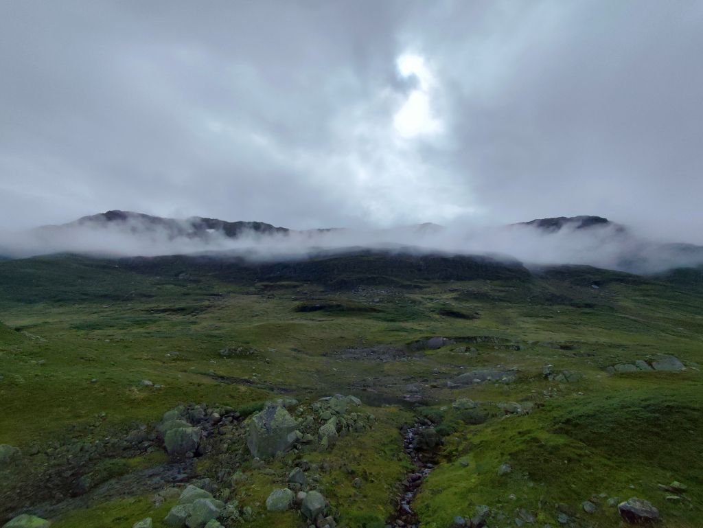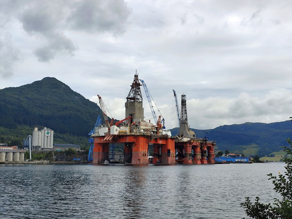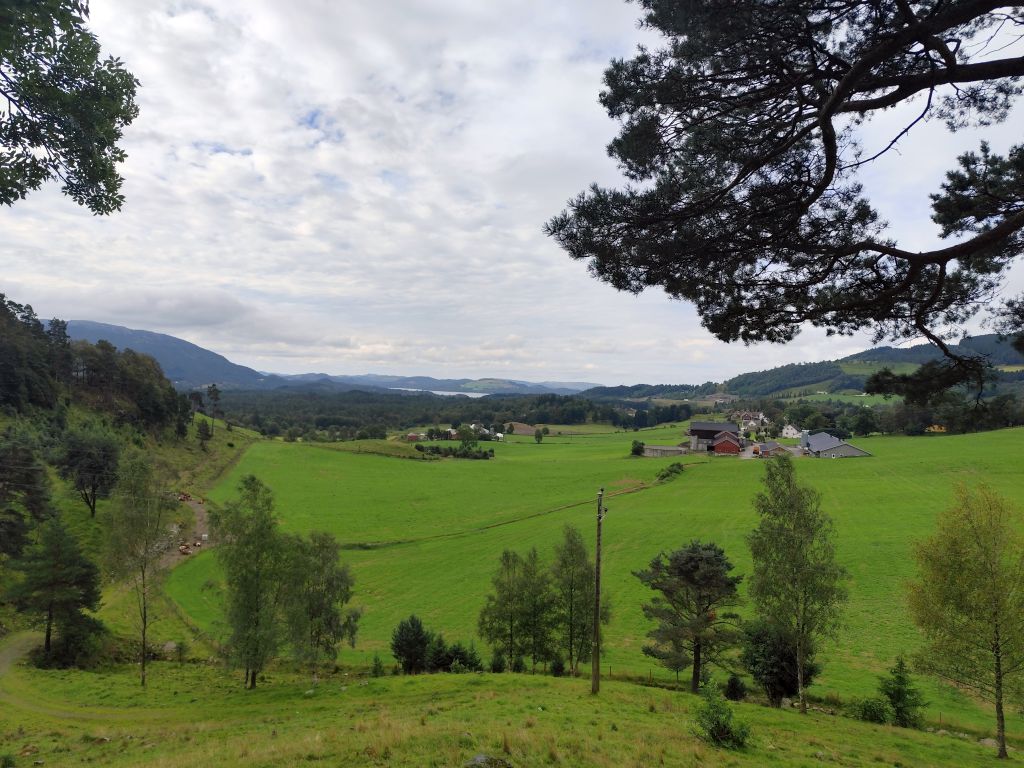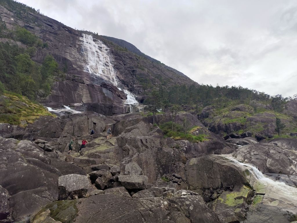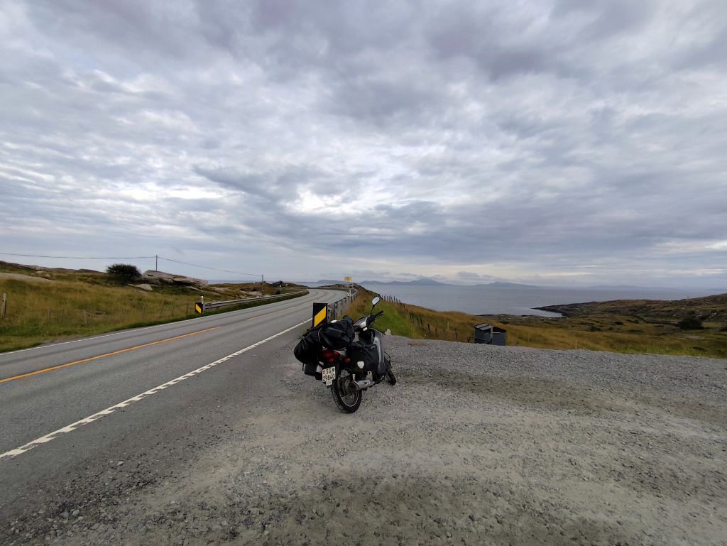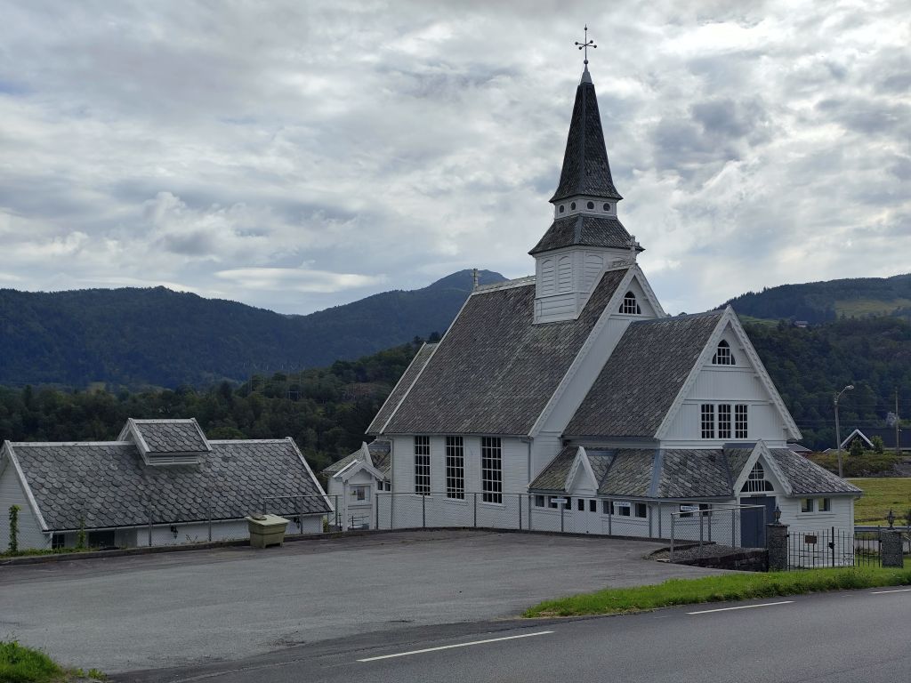 Am Morgen ist der Himmel mit tiefhängenden grauen Wolken bedeckt und es ist in Stavanger noch warm, danach aber sehr kühl. Zweimal geht es mit langen, steilen Tunnels unter einem Fjord hindurch. Ich gelange zur Fähre Mortavika- Asvågen, die ich knapp verpasse, aber jede Viertelstunde fährt ein, so muss ich nicht lange warten, bis die „Boknafjord“ kommt und ich einfahren kann. Das Ticket kann ich auf der Fähre kaufen. Es kostet 55 NOK, das ist sehr bescheiden. Die Fähre ist sehr komfortabel. Ich esse dort eine Omelette zum Znüni. Wir kreuzen mit der Schwesterfähre Raunefjord. In Asvågen fahre ich als erster an Land. In Grinde stoppe ich bei den sieben Menhiren. Es wird geschätzt, dass sie rund um das Jahr 500 gesetzt wurden. In Skjoldastraumen stoppe ich kurz bei dem hübschen Kirchlein, dann fahre ich über die Schleuse und den Damm auf die andere Seite, wo ich kurz die Orientierung verliere, aber bald meinen Weg wieder finde. Danach geht es 134 Kilometer lang auf dem Haukelivegn. Mit flottem Tempo komme ich voran. In Ølensvag halte ich gegenüber einer Werft, die gerade zwei Bohrplattformen dort stehen hat. Beim Langfoss halte ich und bestaune den sehr hohen und wilden Wasserfall. Es geht nun durch zahlreiche Tunnels, der erste, der fast acht Kilometer lange Akrafjordtunnel ist ganz schlecht beleuchtet, so dass ich wahnsinnig aufpassen muss, den Randstein nicht zu treffen. Die übrigen Tunnels sind meist gut beleuchtet. Zweimal geht es durch Kehrtunnels, wie bei der Eisenbahn. Mit dem letzten Tropfen Benzin komme ich kurz vor zwei Uhr in Røldal an, wo ich nachtanke und einen Hamburger von der Tankstelle esse. Ich fahre ins Dorf, es hat dort eine Stavkirken, doch die wollen 80 NOK Eintritt, das ist es mir nicht wert, denn innen sehen die ja eh alle in etwa gleich aus. Die Häuser haben in dieser Gegend alle Grasdächer, manchmal mit einem richtigen Gebüsch drauf. Bis jetzt hat der Regen immer nur getröpfelt, aber 16 Kilometer vor Haukelister fängt er an, richtig heftig zu werden. Da bin ich froh, wieder in einen Tunnel einfahren zu können. Auf der Haukeliseter-Seite ist es wieder einigermassen trocken. Ich erreiche mein Ziel, die Haukeliseter Fjellstue, um zwei Uhr nachmittags. Da der Check-In erst um vier Uhr beginnt, gehe ich in die Sauna. Dreimal gehe ich im kalten Stavatn baden, um mich sogleich wieder in die heisse Sauna zu flüchten. Um vier Uhr checke ich ein. Ich kriege ein Bett in einem Zweierzimmer. Die Hütte ist ohne jeden Komfort, es hat nicht einmal WC oder Dusche, dazu muss man in ein anderes Haus. Ich richte mich ein, koche mir eine Tomatensuppe zum Znacht und gehe in den Aufenthaltsraum im Hauptgebäude, um den Blog zu schreiben, weil es nur dort Wifi-Empfang gibt.