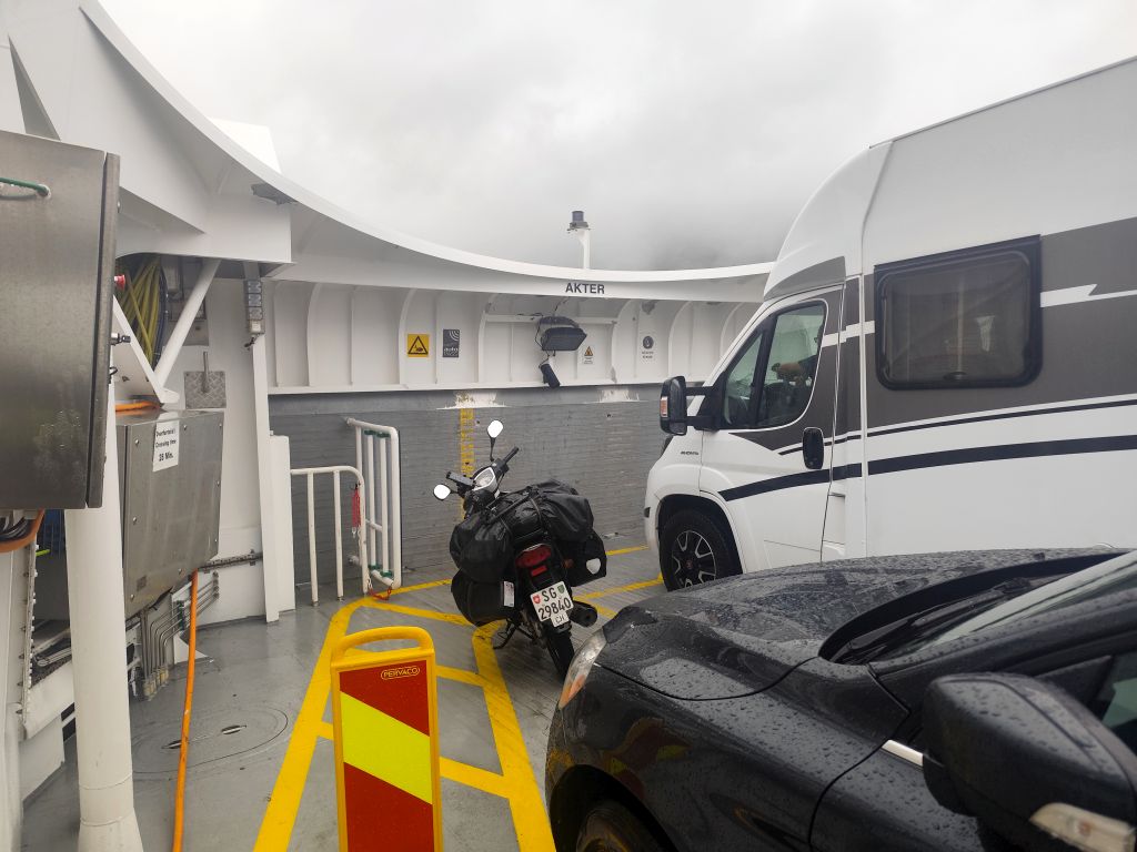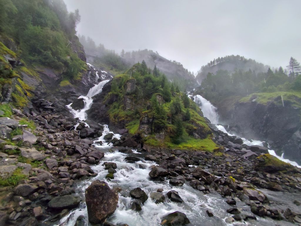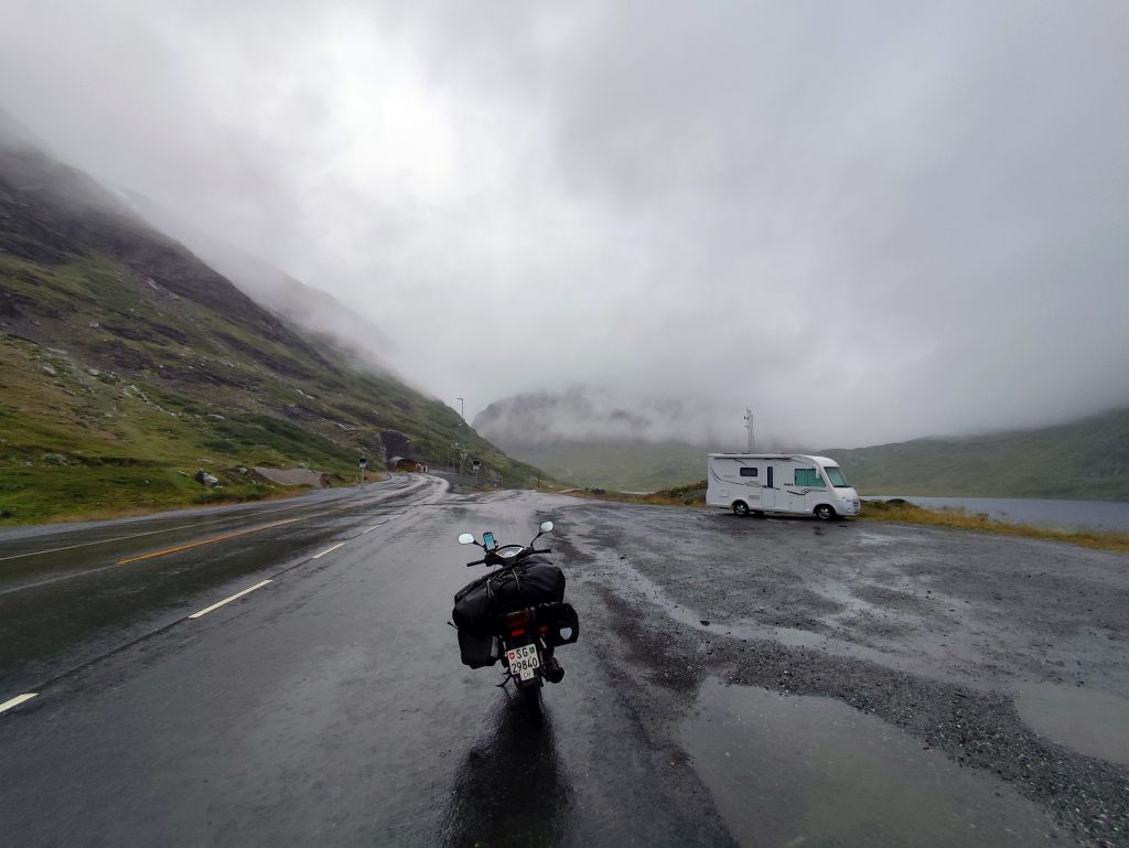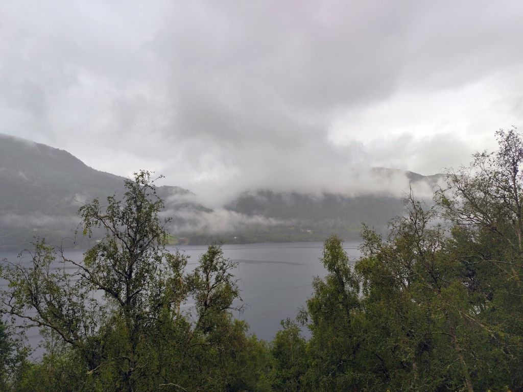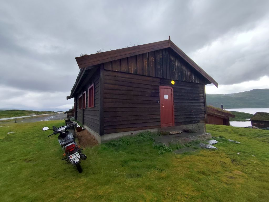 Die Engländerin, die letzte Nacht noch in meine Schlafkammer hinzugestossen ist, entschuldigt sich für die Störung. Dabei ist das doch völlig normal in einem Hostel. Es regnet und es ist kalt. Trotzdem muss ich abfahren. Ich ziehe das ganze Regenzeug an und fahre ab. In Røldal tanke ich nochmals auf und kaufe mir ein Sandwich als Trostpflaster für das schlimme Wetter. Es regnet heftig, der Regen knallt nur so herunter, das Regenzeug ist nutzlos bei solchem Wetter. Das Navi zickt fürchterlich herum wie immer bei Starkregen, denn die schweren Regentropfen auf dem Display wertet es als Klicks. Beim Latefoss Wasserfall halte ich kurz und mache ein Foto. In Odda hat es einen Wegweiser „Altstadt“. Ich folge diesem, finde aber nichts Historisches. Kurz danach komme ich an der riesigen Boliden Odda AS Fabrik vorbei, die Zink produziert. In Utne habe ich Glück, die Fähre nach Kinsarvik kommt gleich. Die Ueberfahrt dauert eine knappe halbe Stunde. In dieser Zeit kann ich im „Salong“ am Trockenen sitzen, während sich unter mir eine Wasserlache bildet. Die Lederhandschuhe kann ich auswinden, so viel Wasser haben die aufgesogen. In Kinsarvik entscheidet sich mein Navi plötzlich um und es wird die Strecke über Kvanndal als richtig angezeigt. Ansonsten soll es einen Umweg von 75 Kilometern und drei Stunden geben. Ich fahre in den Tunnel ein. Das Navi crasht wieder weg und ich navigiere nach Gutdünken über die beiden Kreiselverkehre, die es in dem sehr langen Tunnel drin hat. Als ich das Navi wieder zum Laufen bringe, ist der Umweg weg. Es wird wieder eine Restdistanz von 200 Kilometern angezeigt. Lediglich eine etwas spätere Ankunftszeit. Es geht durch viele kilometerlange lange Tunnels, was mich freut, denn drinnen regnet es zumindes nicht, dafür ist es kälter als draussen. Beim Tvindefossen halte ich kurz und mache ein Foto, aber tatsächlich hat es wegen dem Starkregen an allen Talhängen grosse Wasserfälle, so dass dieser nur einer von hunderten ist. Mit dem letzten Tropfen Benzin komme ich nach Borgund. Ich will noch die Stavkerken besuchen, aber jetzt haben die ein riesiges Empfangsgebäude darum herum gebaut und es stehen mehrere Touristenbusse da, zwei kommen gerade an und Hundert Autos sind parkiert. Ich verzichte dankend auf den Besuch. Tatsächlich hat es hier eine Tankstelle, so dass ich nicht aus dem Kanister nachfüllen muss, was immer eine riesen Sauerei macht. Am Schluss kommt nochmals ein 25 Kilometer langer, schlecht beleuchteter Tunnel, dann muss ich nur noch ein paar Kilometer fahren, bis ich zu meiner Unterkunft, der Tyinstolen Turisthytte, komme. Es ist einmal mehr eine sehr einfache Unterkunft, ohne WC/Dusche, diese muss man wie schon gestern im Hauptgebäude suchen. Ich hänge alle meine Sachen zum Trocknen auf – das Wasser ist überall hineingekommen, alles ist tropfnass, selbst die Schuhe sind völlig durchnässt. Handschuhe und Schuhe föhne ich. Dann koche ich mir ein grosses Nachtessen: Weisse Bohnen, Thunfisch, Spargelcremesuppe. Ich bin heute 322 Kilometer im Regen gefahren.