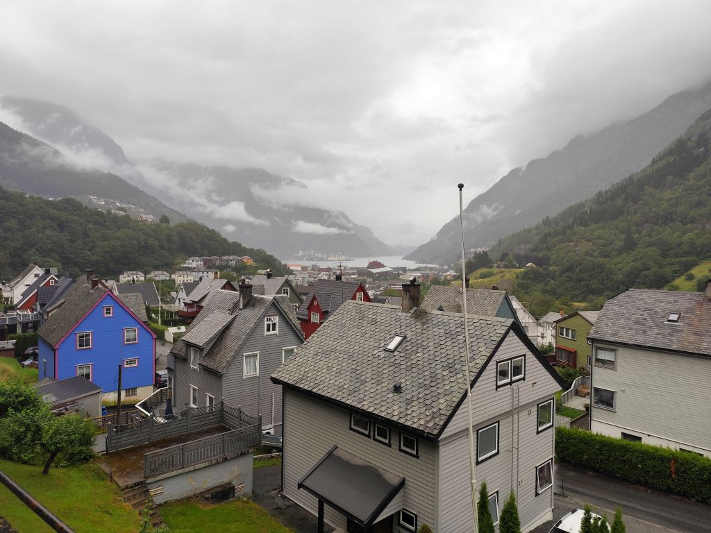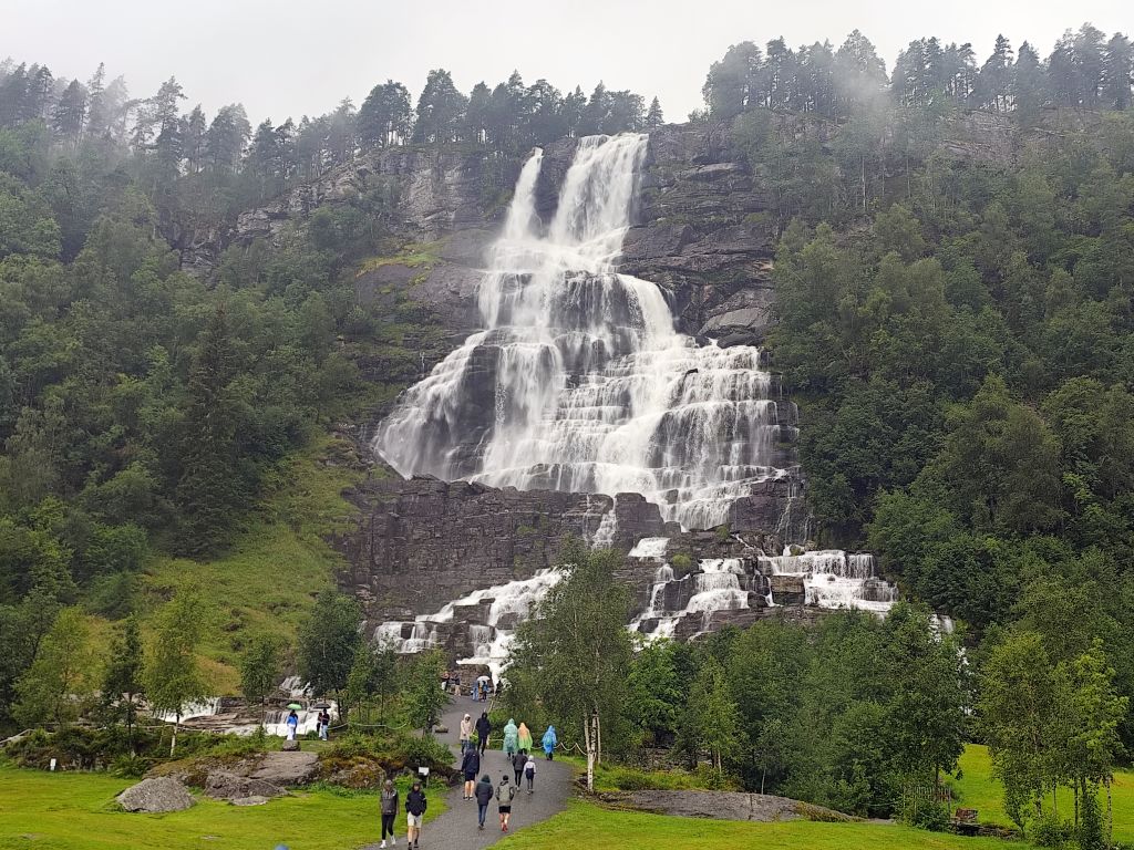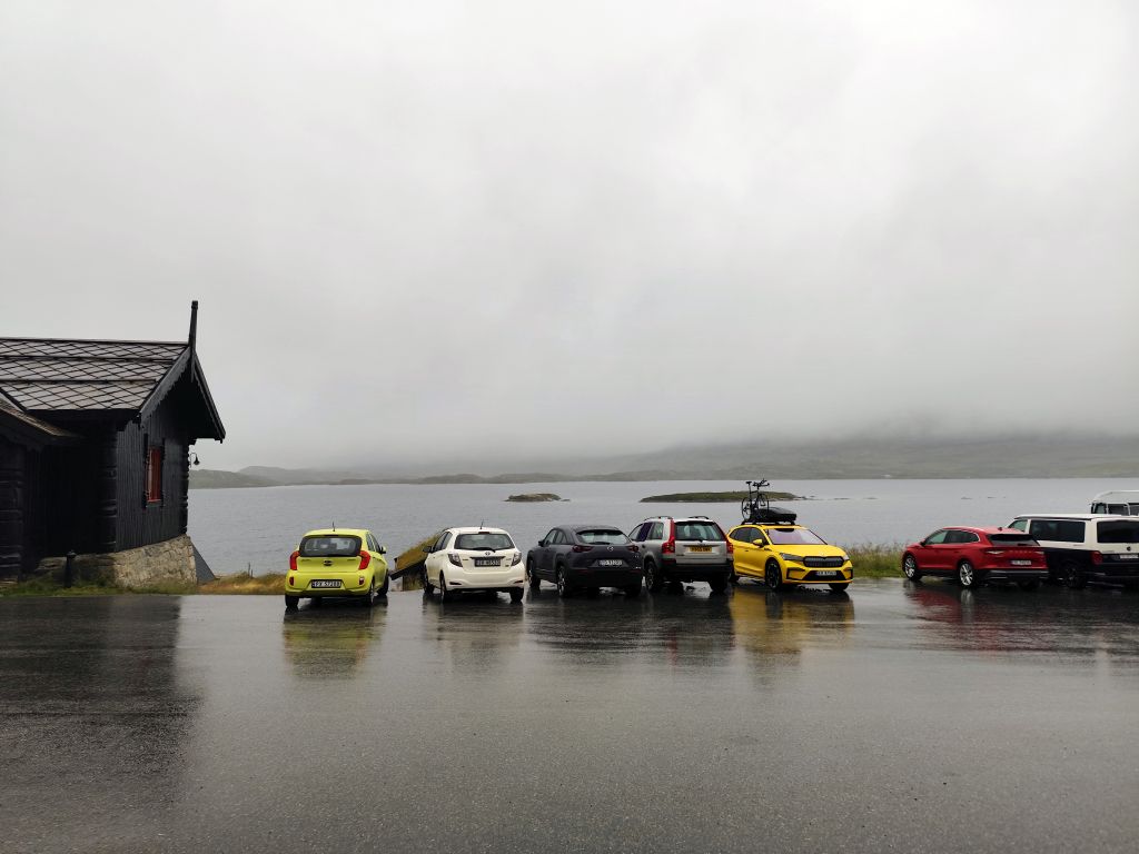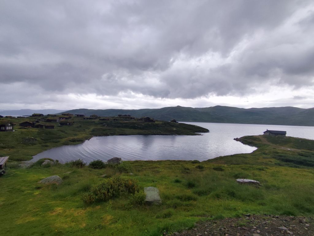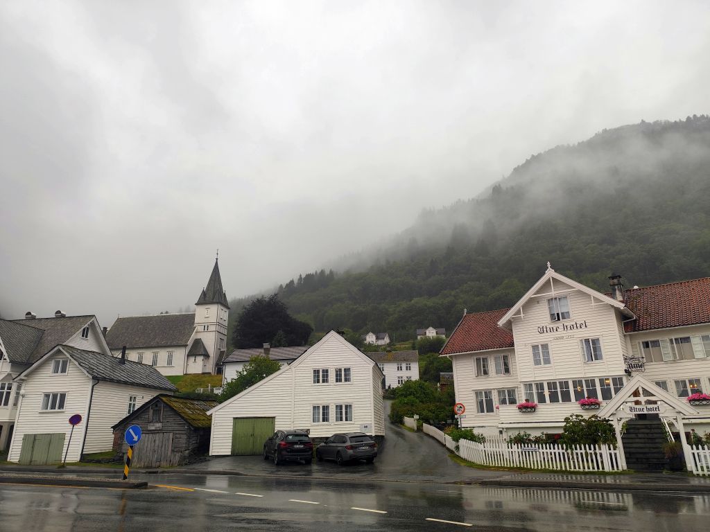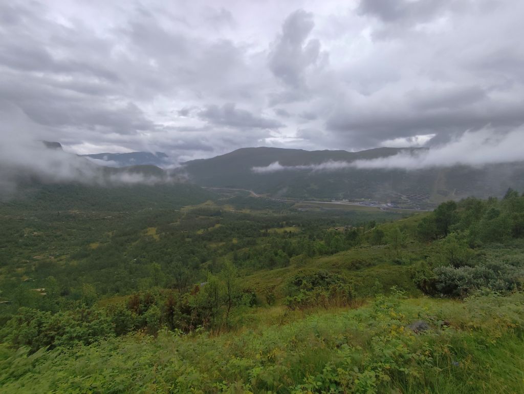 Die Engländerin, die letzte Nacht noch in meine Schlafkammer hinzugestossen ist, entschuldigt sich für die Störung. Dabei ist das doch völlig normal in einem Hostel. Es regnet und es ist kalt. Trotzdem muss ich abfahren. Ich ziehe das ganze Regenzeug an und fahre ab. In Røldal tanke ich nochmals auf und kaufe mir ein Sandwich als Trostpflaster für das schlimme Wetter. Es regnet heftig, der Regen knallt nur so herunter, das Regenzeug ist nutzlos bei solchem Wetter. Das Navi zickt fürchterlich herum wie immer bei Starkregen, denn die schweren Regentropfen auf dem Display wertet es als Klicks. Beim Latefoss Wasserfall halte ich kurz und mache ein Foto. In Odda hat es einen Wegweiser „Altstadt“. Ich folge diesem, finde aber nichts Historisches. Kurz danach komme ich an der riesigen Boliden Odda AS Fabrik vorbei, die Zink produziert. In Utne habe ich Glück, die Fähre nach Kinsarvik kommt gleich. Die Ueberfahrt dauert eine knappe halbe Stunde. In dieser Zeit kann ich im „Salong“ am Trockenen sitzen, während sich unter mir eine Wasserlache bildet. Die Lederhandschuhe kann ich auswinden, so viel Wasser haben die aufgesogen. In Kinsarvik entscheidet sich mein Navi plötzlich um und es wird die Strecke über Kvanndal als richtig angezeigt. Ansonsten soll es einen Umweg von 75 Kilometern und drei Stunden geben. Ich fahre in den Tunnel ein. Das Navi crasht wieder weg und ich navigiere nach Gutdünken über die beiden Kreiselverkehre, die es in dem sehr langen Tunnel drin hat. Als ich das Navi wieder zum Laufen bringe, ist der Umweg weg. Es wird wieder eine Restdistanz von 200 Kilometern angezeigt. Lediglich eine etwas spätere Ankunftszeit. Es geht durch viele kilometerlange lange Tunnels, was mich freut, denn drinnen regnet es zumindes nicht, dafür ist es kälter als draussen. Beim Tvindefossen halte ich kurz und mache ein Foto, aber tatsächlich hat es wegen dem Starkregen an allen Talhängen grosse Wasserfälle, so dass dieser nur einer von hunderten ist. Mit dem letzten Tropfen Benzin komme ich nach Borgund. Ich will noch die Stavkerken besuchen, aber jetzt haben die ein riesiges Empfangsgebäude darum herum gebaut und es stehen mehrere Touristenbusse da, zwei kommen gerade an und Hundert Autos sind parkiert. Ich verzichte dankend auf den Besuch. Tatsächlich hat es hier eine Tankstelle, so dass ich nicht aus dem Kanister nachfüllen muss, was immer eine riesen Sauerei macht. Am Schluss kommt nochmals ein 25 Kilometer langer, schlecht beleuchteter Tunnel, dann muss ich nur noch ein paar Kilometer fahren, bis ich zu meiner Unterkunft, der Tyinstolen Turisthytte, komme. Es ist einmal mehr eine sehr einfache Unterkunft, ohne WC/Dusche, diese muss man wie schon gestern im Hauptgebäude suchen. Ich hänge alle meine Sachen zum Trocknen auf – das Wasser ist überall hineingekommen, alles ist tropfnass, selbst die Schuhe sind völlig durchnässt. Handschuhe und Schuhe föhne ich. Dann koche ich mir ein grosses Nachtessen: Weisse Bohnen, Thunfisch, Spargelcremesuppe. Ich bin heute 322 Kilometer im Regen gefahren.