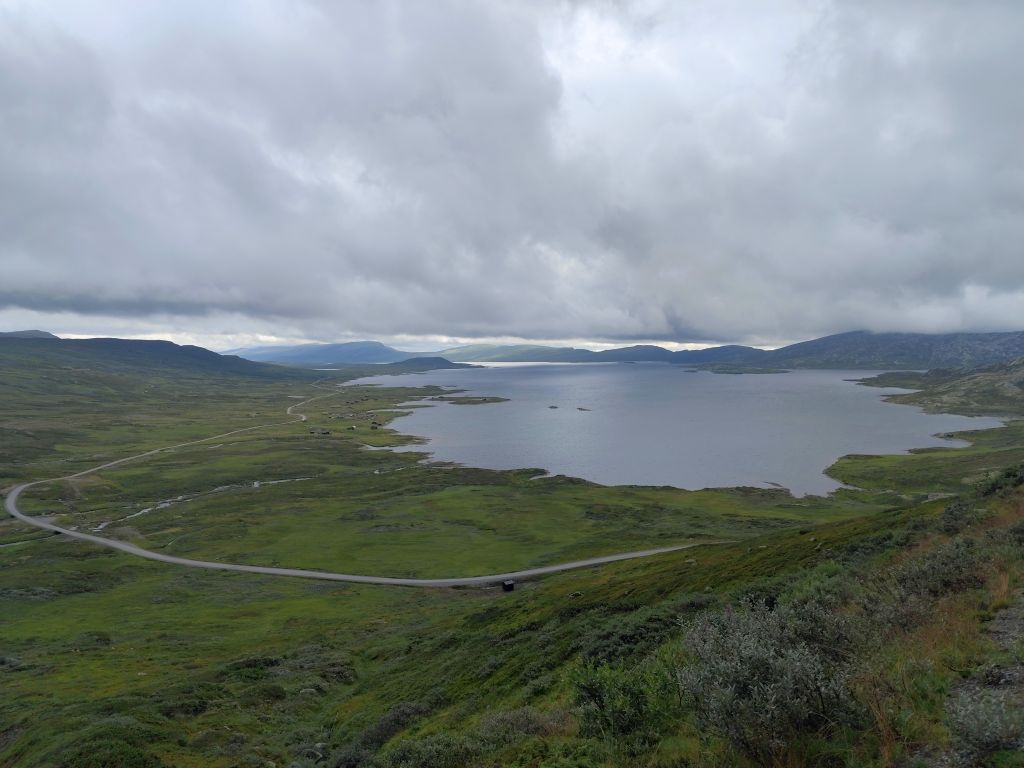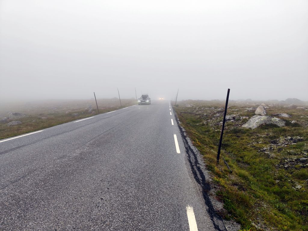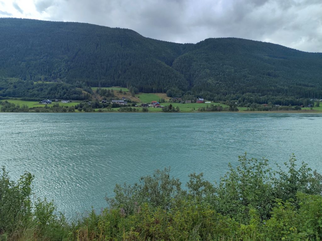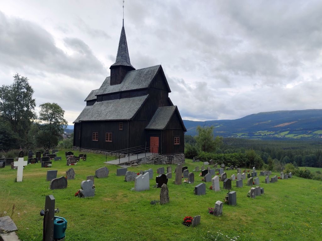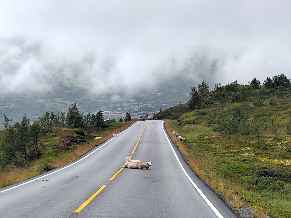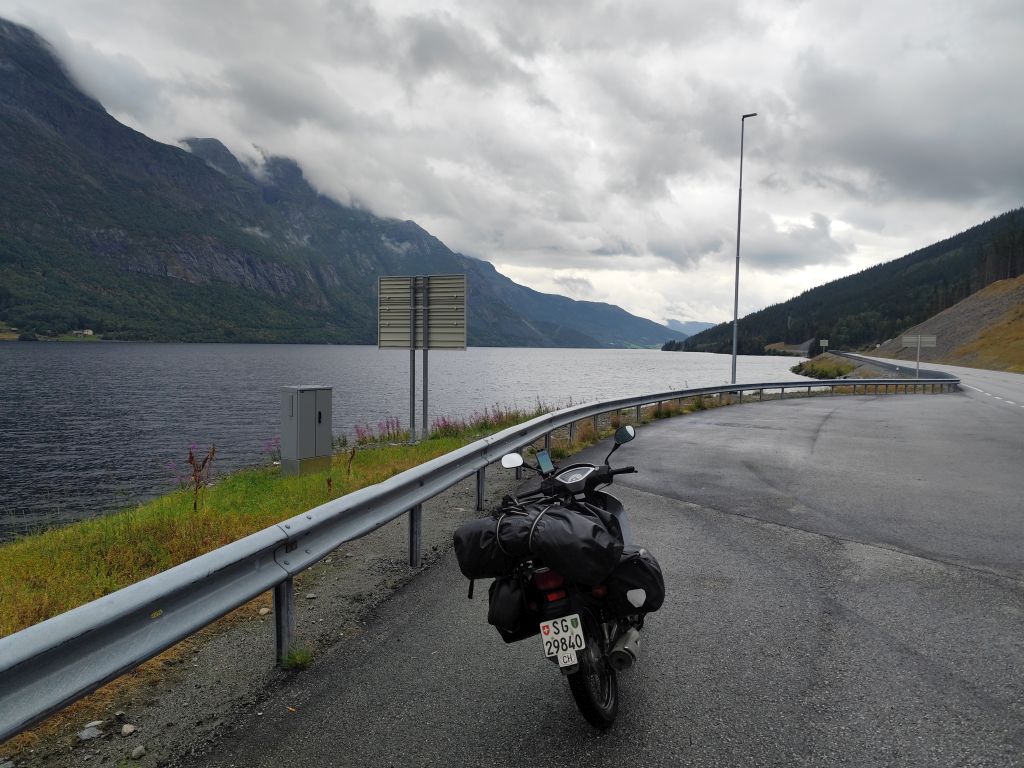 Es regnet noch, als ich zum Duschen gehe. Ich ziehe das Regenzeug an. Aber wie ich abfahre, hört der Regen langsam auf. Schafe versperren die Strasse. Schon bald muss ich den ersten Halt einlegen, bei der Øye Stavkyrkje. Die ersten 70 Kilometer dauern fast drei Stunden, denn trotz den tiefhängenden Wolken ist die Landschaft wunderschön und es gibt viele Sehenswürdigkeiten. Es geht dem Vangsmjøse entlang. In Vang bewundere ich den Vangsteinen aus Wikingerzeit. In Høre halte ich bei der Stavkirken, die natürlich um diese Zeit noch geschlossen ist. Vor Beitostølen komme ich zu einer historischen Wassermühle, die malerisch in einem Tobel liegt. In Beitostølen kaufe ich im Supermarkt zwei Vollkornbrötli und Salami, eines esse ich sofort. Ueber den Bygdinvegen gelange ich zu einer Hochebene Valdresflye. Auf dem Jotunheimvegen gelange ich in dichtesten Nebel. Danach hat man wieder eine schöne Aussicht. Es geht runter an den Otta See. Bei Vågå verpasse ich die Abzweigung und muss zehn Kilometer zurückfahren. Danach ist die Landschaft weniger eindrucksvoll und ich kann es mir auch gar nicht mehr leisten, ständig anzuhalten und zu fotografieren, weil die Zeit drängt. Ich möchte ja am Abend in Trondheim ankommen. So fahre ich mit konstant 80 km/h Richtung Trondheim. Es ist ziemlich kalt, einstellige Grade. Manchmal regnet es, aber nie so stark wie gestern. Und ich habe ja das Regenzeug an. In Trondheim gehe ich noch einkaufen, ein Abendessen und Haferflocken. Dann fahre ich zum Hostel, das sich als neues, extrem sauberes, gut organisiertes Hostel entpuppt. Leider ist es auch hier verboten, den Scooter auf der Strasse abzustellen, weshalb ich für zwei Tage einen absurd teuren Garagenplatz mieten muss.