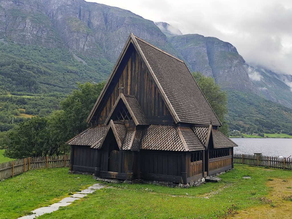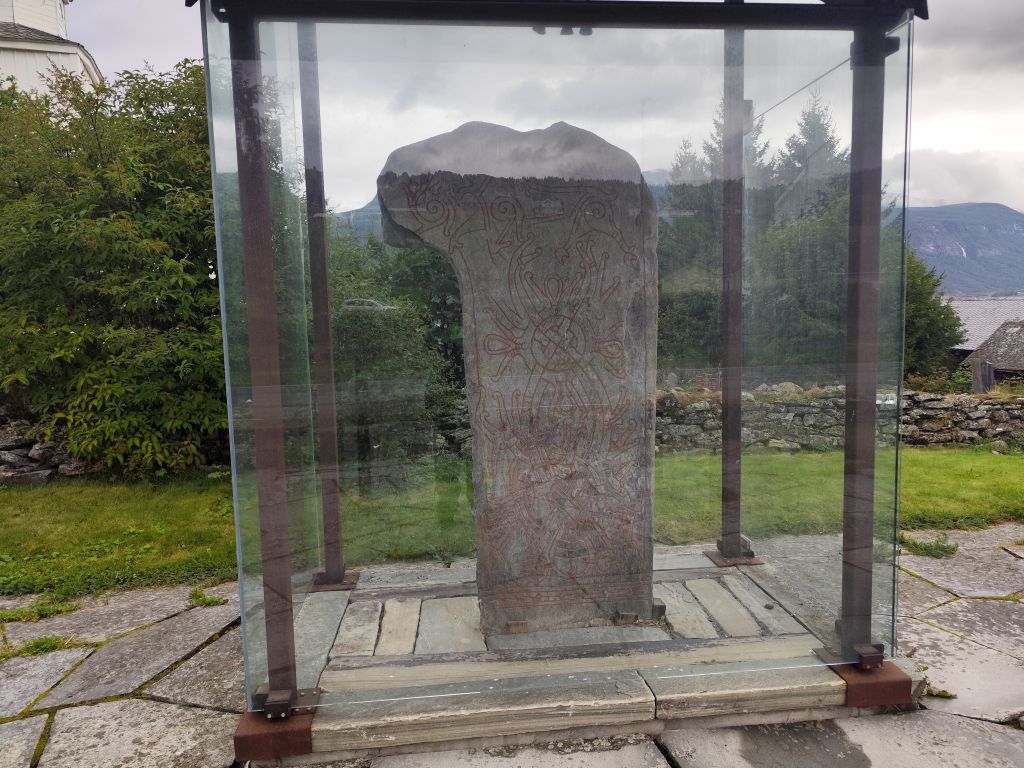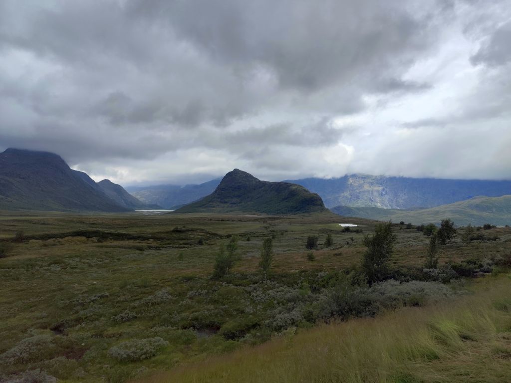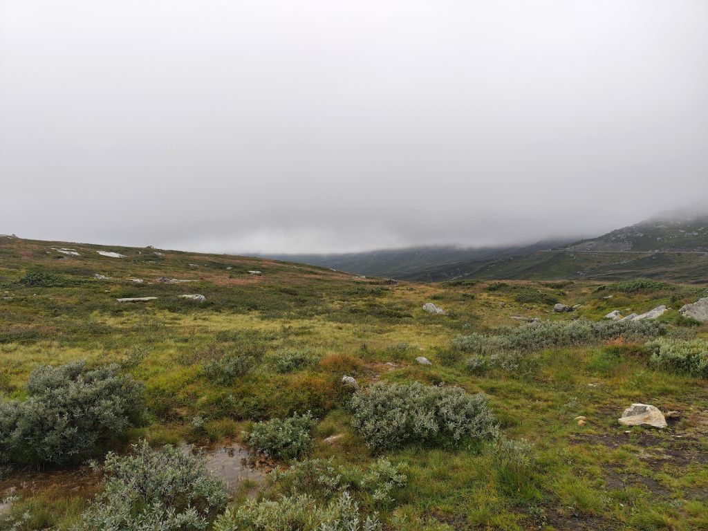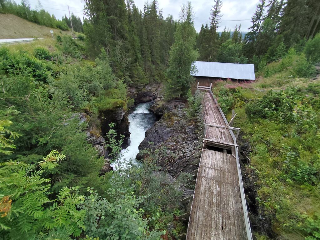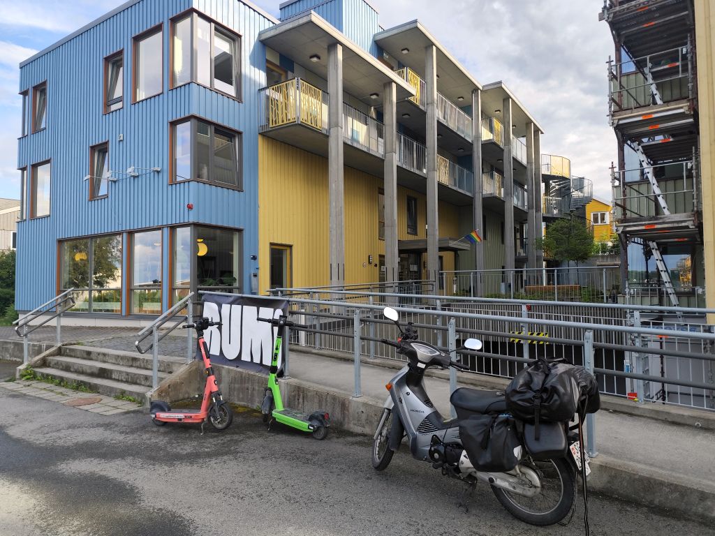 Es regnet noch, als ich zum Duschen gehe. Ich ziehe das Regenzeug an. Aber wie ich abfahre, hört der Regen langsam auf. Schafe versperren die Strasse. Schon bald muss ich den ersten Halt einlegen, bei der Øye Stavkyrkje. Die ersten 70 Kilometer dauern fast drei Stunden, denn trotz den tiefhängenden Wolken ist die Landschaft wunderschön und es gibt viele Sehenswürdigkeiten. Es geht dem Vangsmjøse entlang. In Vang bewundere ich den Vangsteinen aus Wikingerzeit. In Høre halte ich bei der Stavkirken, die natürlich um diese Zeit noch geschlossen ist. Vor Beitostølen komme ich zu einer historischen Wassermühle, die malerisch in einem Tobel liegt. In Beitostølen kaufe ich im Supermarkt zwei Vollkornbrötli und Salami, eines esse ich sofort. Ueber den Bygdinvegen gelange ich zu einer Hochebene Valdresflye. Auf dem Jotunheimvegen gelange ich in dichtesten Nebel. Danach hat man wieder eine schöne Aussicht. Es geht runter an den Otta See. Bei Vågå verpasse ich die Abzweigung und muss zehn Kilometer zurückfahren. Danach ist die Landschaft weniger eindrucksvoll und ich kann es mir auch gar nicht mehr leisten, ständig anzuhalten und zu fotografieren, weil die Zeit drängt. Ich möchte ja am Abend in Trondheim ankommen. So fahre ich mit konstant 80 km/h Richtung Trondheim. Es ist ziemlich kalt, einstellige Grade. Manchmal regnet es, aber nie so stark wie gestern. Und ich habe ja das Regenzeug an. In Trondheim gehe ich noch einkaufen, ein Abendessen und Haferflocken. Dann fahre ich zum Hostel, das sich als neues, extrem sauberes, gut organisiertes Hostel entpuppt. Leider ist es auch hier verboten, den Scooter auf der Strasse abzustellen, weshalb ich für zwei Tage einen absurd teuren Garagenplatz mieten muss.