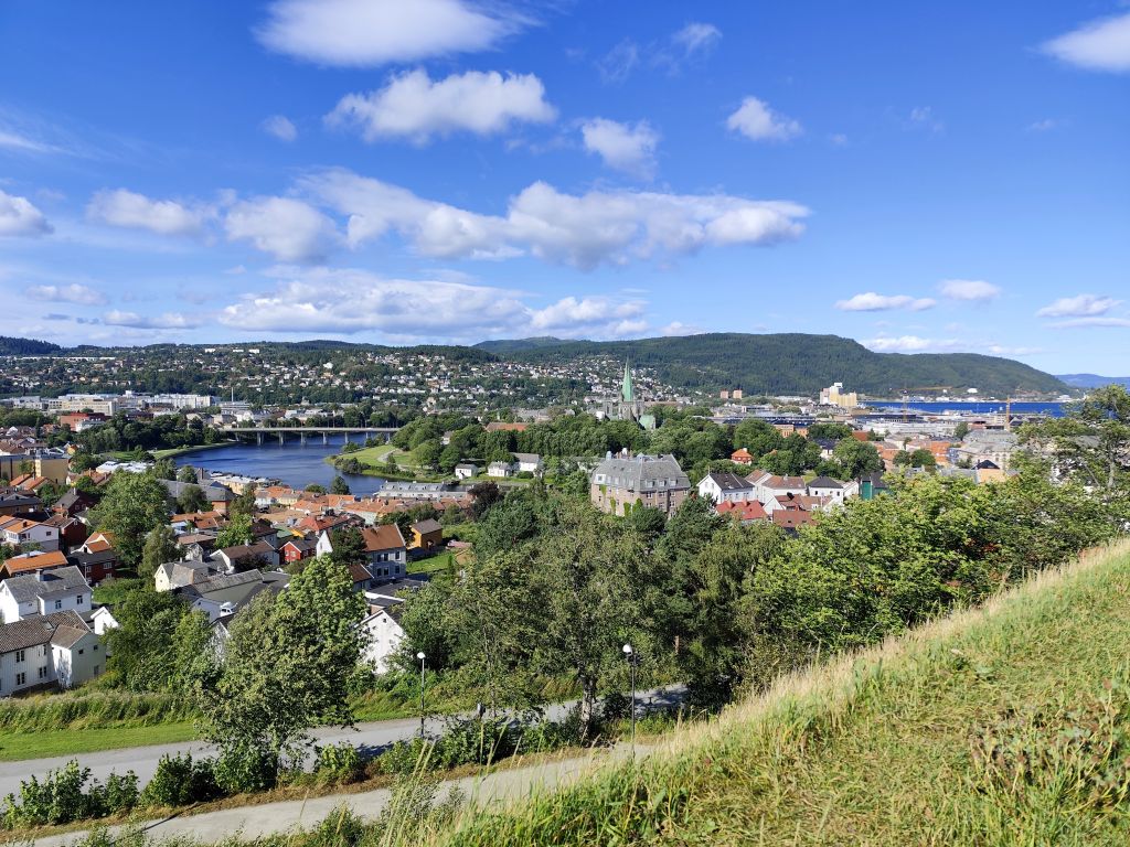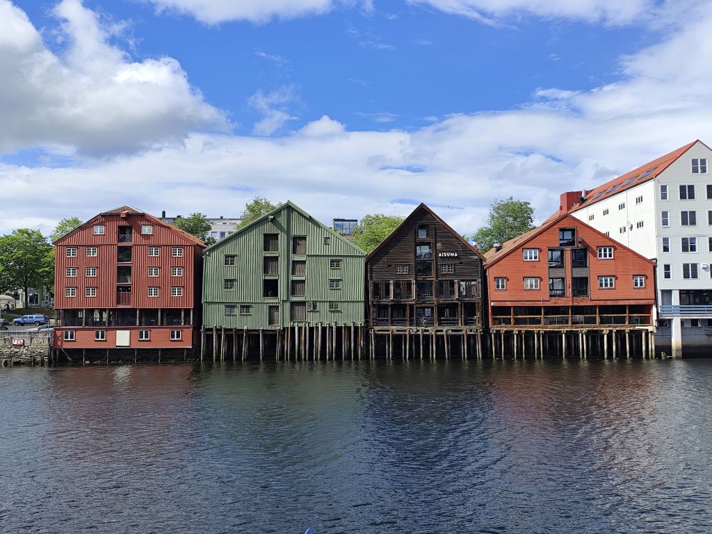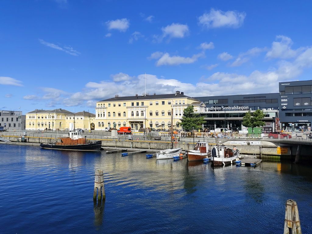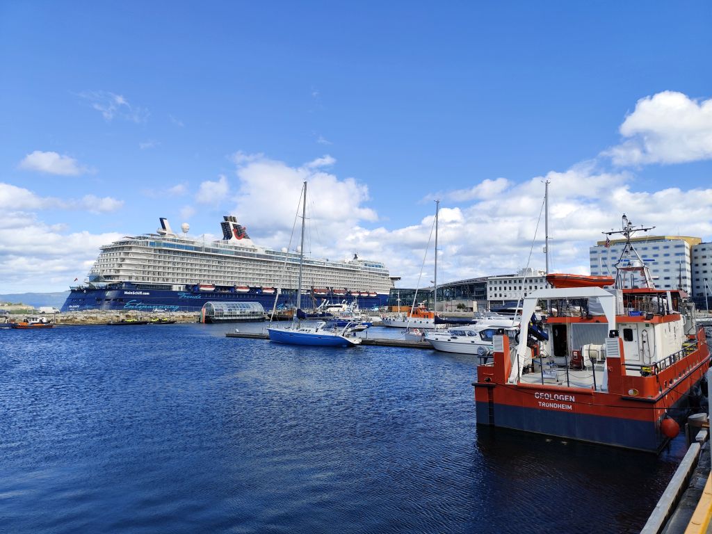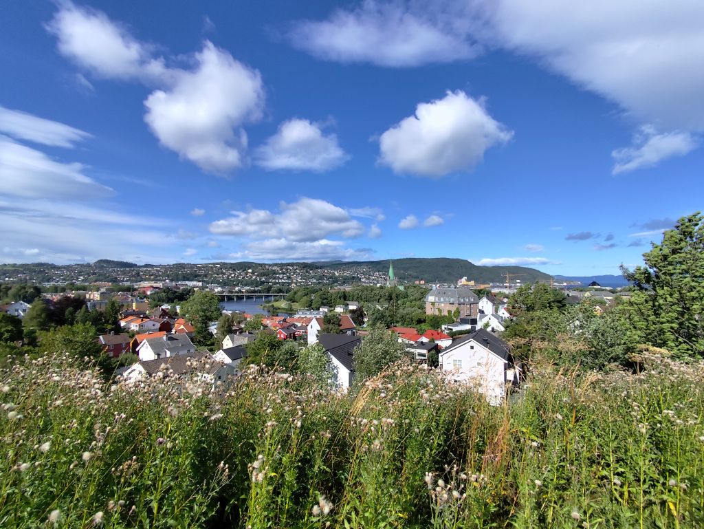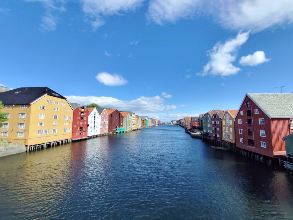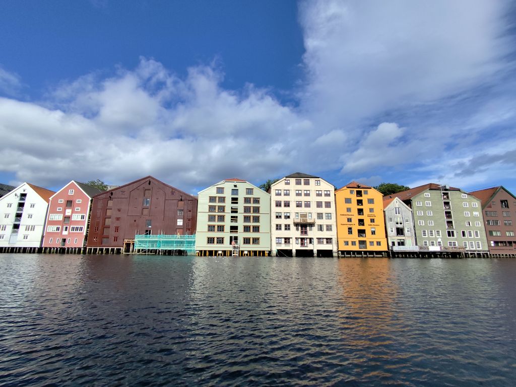 Stundenlang mache ich Buchungen für Lofoten. Das ist sehr schwierig, weil fast alles ausgebucht ist und ich nur noch wenige valable Unterkünfte finde. Dann laufe ich in die Stadt. Das Wetter ist wunderschön, der Himmel ist blau mit weissen Wölkchen, es ist warm. Ich beginne am Thaulowkaia, bestaune die Bryggene (die farbigen Lagerhäuser entlang der Nidelva), laufe durch die Nedre Bakklandet, die eine einzige Baustelle ist. Interessantes Detail: Die Bagger sind elektrisch angetrieben. Da die Strasse zur Gamle Bybro gesperrt ist, laufe ich zur Kristiansten Festung hoch und besuche sie gleich. Im Turm ist ein Museum untergebracht, das den Krieg zwischen den schwedischen und den norwegischen Truppen im 18. Jahrhundert zum Thema hat. Von hier aus gelange ich zum Øvre Bakklandet, wie der Nedre Bakklandet von farbigen Holzhäuschen gesäumt. Jetzt kann ich über die Gamle Bybro, eine ehemalige Ziehbrücke, laufen und gelange zum Nidarosdomen. Ich erschrecke schon, als hier ein riesiges Visitor Centre gebaut worden ist. Das „Mein Schiff“ hat wohl rund viertausend deutsche Touristen in die Stadt geschwemmt, von denen nur ganz viele hier anstehen. So verzichte ich auf einen Besuch. Gleich daneben ist der Erzbischofspalast, der diverse Museen birgt, die mich aber nicht weiter interessieren. Ich laufe quer durch die Stadt zum Torvet (Marktplatz), wo sich MacDonalds und Burger King die Hände geben. Unweit entfernt ist der Stiftsgården (ehemaliger Königspalast). Danach kommt die wie in fast allen besuchten Städten mit farbigen Regenschirmen dekorierte Thomas Angelis Gate und dann der Kanalen, wo unzählige Schiffe angebunden sind. Direkt am Kanalen liegt auch der Hauptbahnhof, den ich über die Jernbanebrua erreiche. Im Kanalen verankert ist auch die D/S Hansteen, die allem Anschein noch mit Dampf betrieben wird, aber nicht mehr mit Kohlen beheizt. Hinter dem Bahnhof kommt die Brattørkaia, wo an einem Steg das riesige Kreuzfahrtschiff „Mein Schiff“ vor Anker liegt. Ich habe starken Hunger und nehme das erstbeste Mittagessen, das ich finde. Im Supermarkt kaufe ich noch Wasser und Nüsse. Ich überquere die Nedelva zum TMV-Kaia, komme zur Bakke Kirke und laufe nochmals zu den schönen Bryggene. Ueber die Elgeseter Bru laufe ich ans andere Ufer nach Brendablikk, dann den Uferweg entlang zur Gangbrua, über die ich wieder zurücklaufe und zur Lien Kirke und Skansen komme. Für die Eisenbahn wurde eine monströse klappbare Brücke, die Skansen Bru gebaut, doch die neuere Fussgängerbrücke ist gar nicht mehr klappbar, so dass hier Segelschiffe nicht mehr durchkommen. Zurück am Brattørkaia bewundere ich noch die originelle Skulptur „What does the Fjord say?“, eine Kugel, wo verschiedene Trichter die Töne ins Innere leiten. Es ist jetzt vier Uhr, ich bin müde und der Himmel hat sich mit dunklen Gewitterwolken bedeckt, so dass ich zurück ins Hostel laufe.