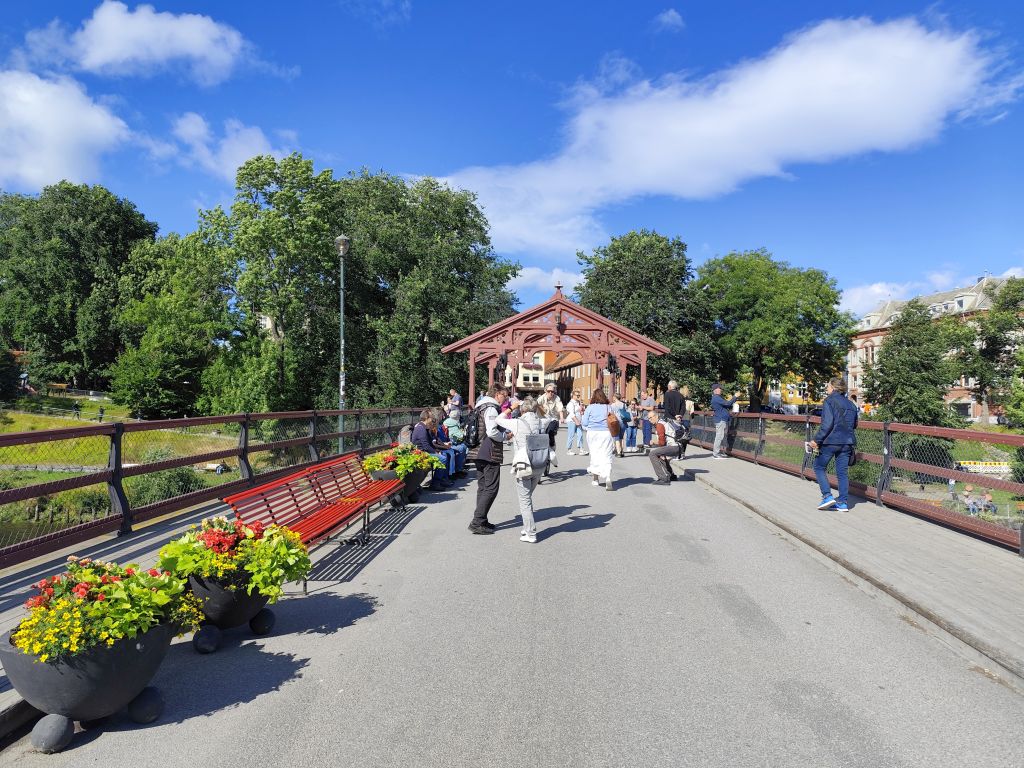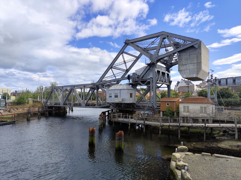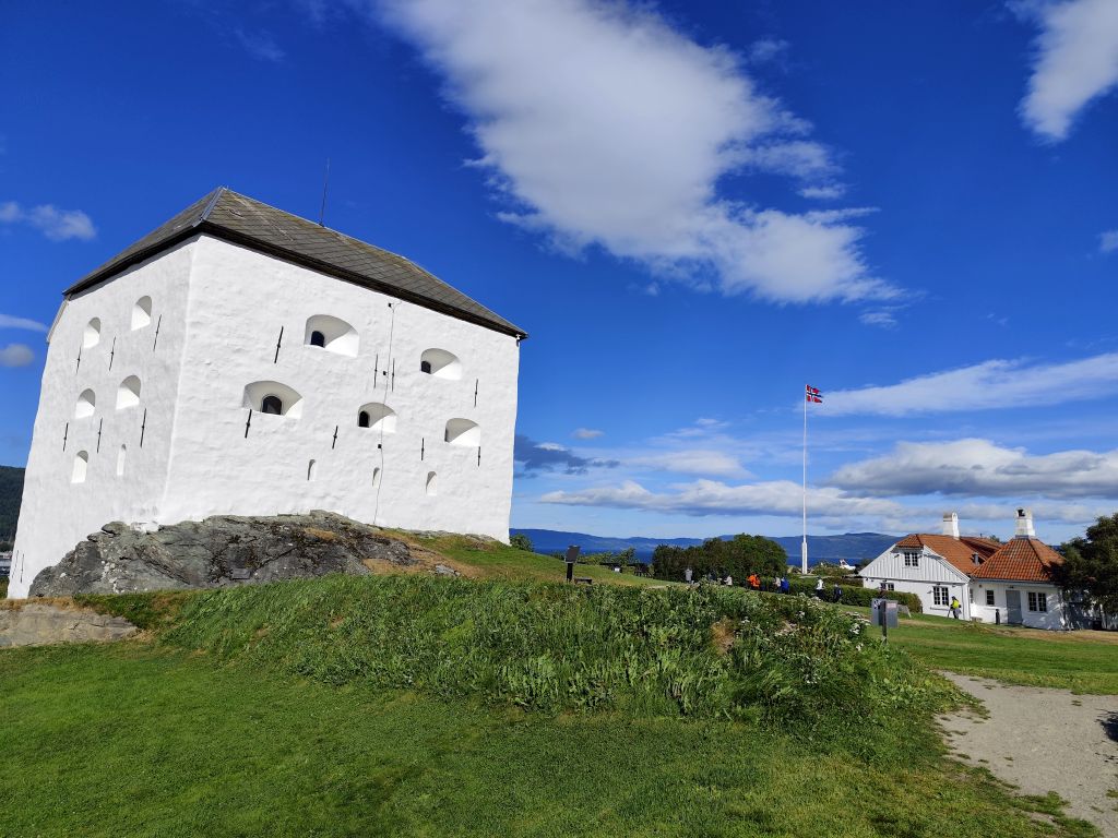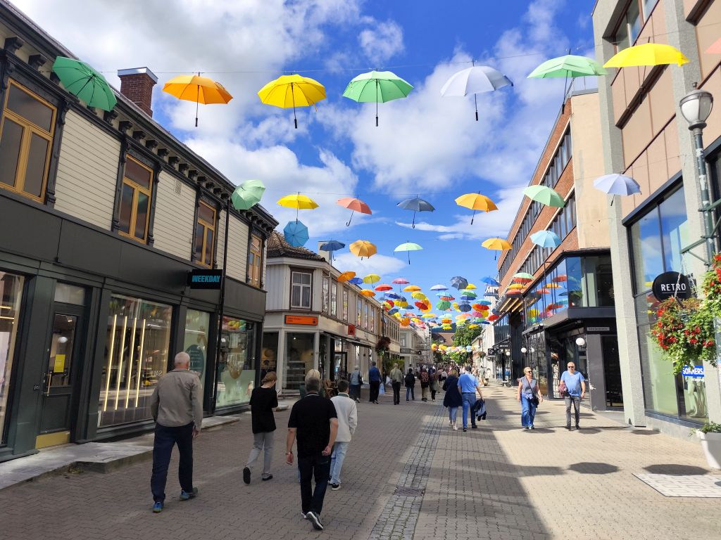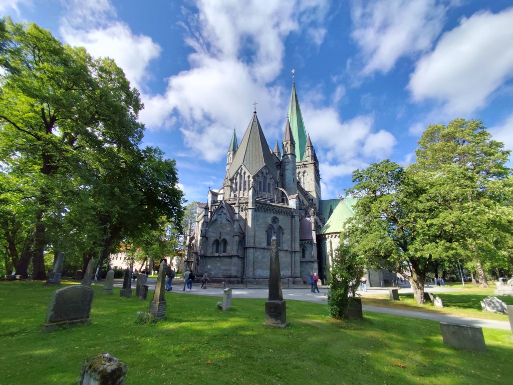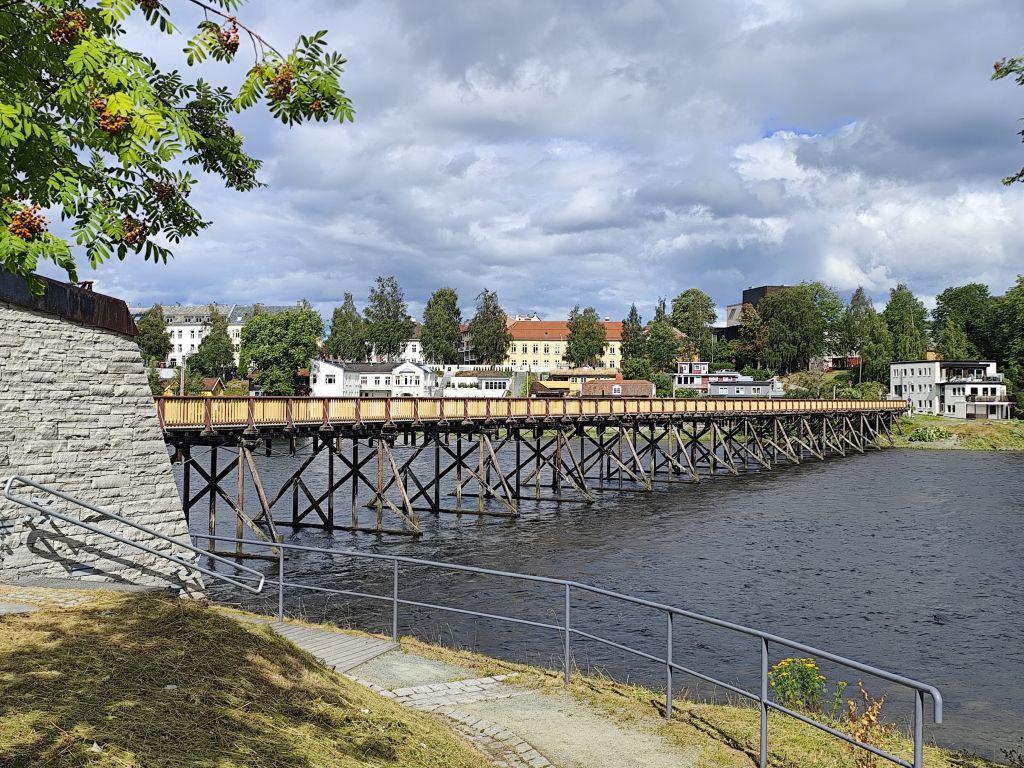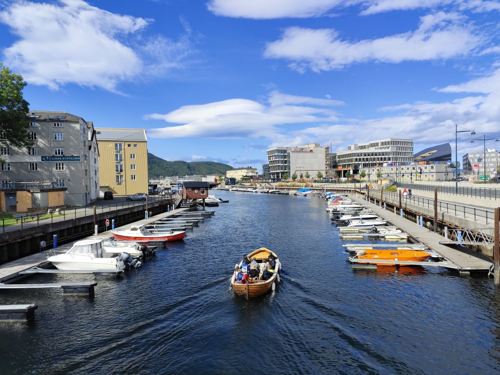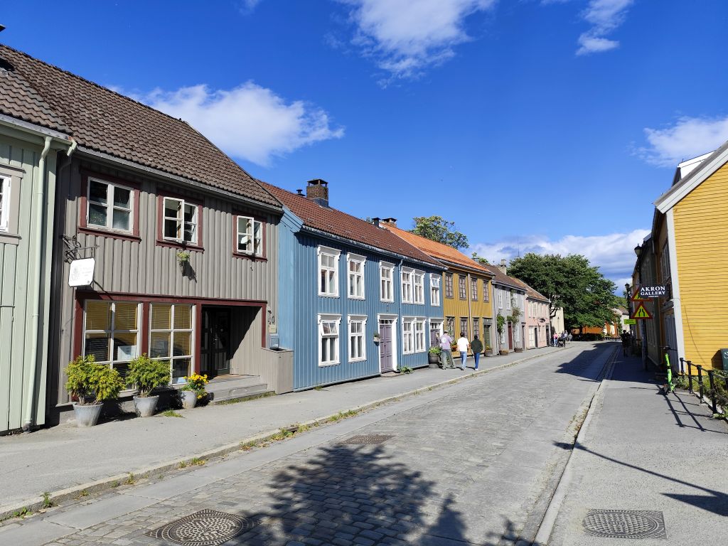 Stundenlang mache ich Buchungen für Lofoten. Das ist sehr schwierig, weil fast alles ausgebucht ist und ich nur noch wenige valable Unterkünfte finde. Dann laufe ich in die Stadt. Das Wetter ist wunderschön, der Himmel ist blau mit weissen Wölkchen, es ist warm. Ich beginne am Thaulowkaia, bestaune die Bryggene (die farbigen Lagerhäuser entlang der Nidelva), laufe durch die Nedre Bakklandet, die eine einzige Baustelle ist. Interessantes Detail: Die Bagger sind elektrisch angetrieben. Da die Strasse zur Gamle Bybro gesperrt ist, laufe ich zur Kristiansten Festung hoch und besuche sie gleich. Im Turm ist ein Museum untergebracht, das den Krieg zwischen den schwedischen und den norwegischen Truppen im 18. Jahrhundert zum Thema hat. Von hier aus gelange ich zum Øvre Bakklandet, wie der Nedre Bakklandet von farbigen Holzhäuschen gesäumt. Jetzt kann ich über die Gamle Bybro, eine ehemalige Ziehbrücke, laufen und gelange zum Nidarosdomen. Ich erschrecke schon, als hier ein riesiges Visitor Centre gebaut worden ist. Das „Mein Schiff“ hat wohl rund viertausend deutsche Touristen in die Stadt geschwemmt, von denen nur ganz viele hier anstehen. So verzichte ich auf einen Besuch. Gleich daneben ist der Erzbischofspalast, der diverse Museen birgt, die mich aber nicht weiter interessieren. Ich laufe quer durch die Stadt zum Torvet (Marktplatz), wo sich MacDonalds und Burger King die Hände geben. Unweit entfernt ist der Stiftsgården (ehemaliger Königspalast). Danach kommt die wie in fast allen besuchten Städten mit farbigen Regenschirmen dekorierte Thomas Angelis Gate und dann der Kanalen, wo unzählige Schiffe angebunden sind. Direkt am Kanalen liegt auch der Hauptbahnhof, den ich über die Jernbanebrua erreiche. Im Kanalen verankert ist auch die D/S Hansteen, die allem Anschein noch mit Dampf betrieben wird, aber nicht mehr mit Kohlen beheizt. Hinter dem Bahnhof kommt die Brattørkaia, wo an einem Steg das riesige Kreuzfahrtschiff „Mein Schiff“ vor Anker liegt. Ich habe starken Hunger und nehme das erstbeste Mittagessen, das ich finde. Im Supermarkt kaufe ich noch Wasser und Nüsse. Ich überquere die Nedelva zum TMV-Kaia, komme zur Bakke Kirke und laufe nochmals zu den schönen Bryggene. Ueber die Elgeseter Bru laufe ich ans andere Ufer nach Brendablikk, dann den Uferweg entlang zur Gangbrua, über die ich wieder zurücklaufe und zur Lien Kirke und Skansen komme. Für die Eisenbahn wurde eine monströse klappbare Brücke, die Skansen Bru gebaut, doch die neuere Fussgängerbrücke ist gar nicht mehr klappbar, so dass hier Segelschiffe nicht mehr durchkommen. Zurück am Brattørkaia bewundere ich noch die originelle Skulptur „What does the Fjord say?“, eine Kugel, wo verschiedene Trichter die Töne ins Innere leiten. Es ist jetzt vier Uhr, ich bin müde und der Himmel hat sich mit dunklen Gewitterwolken bedeckt, so dass ich zurück ins Hostel laufe.