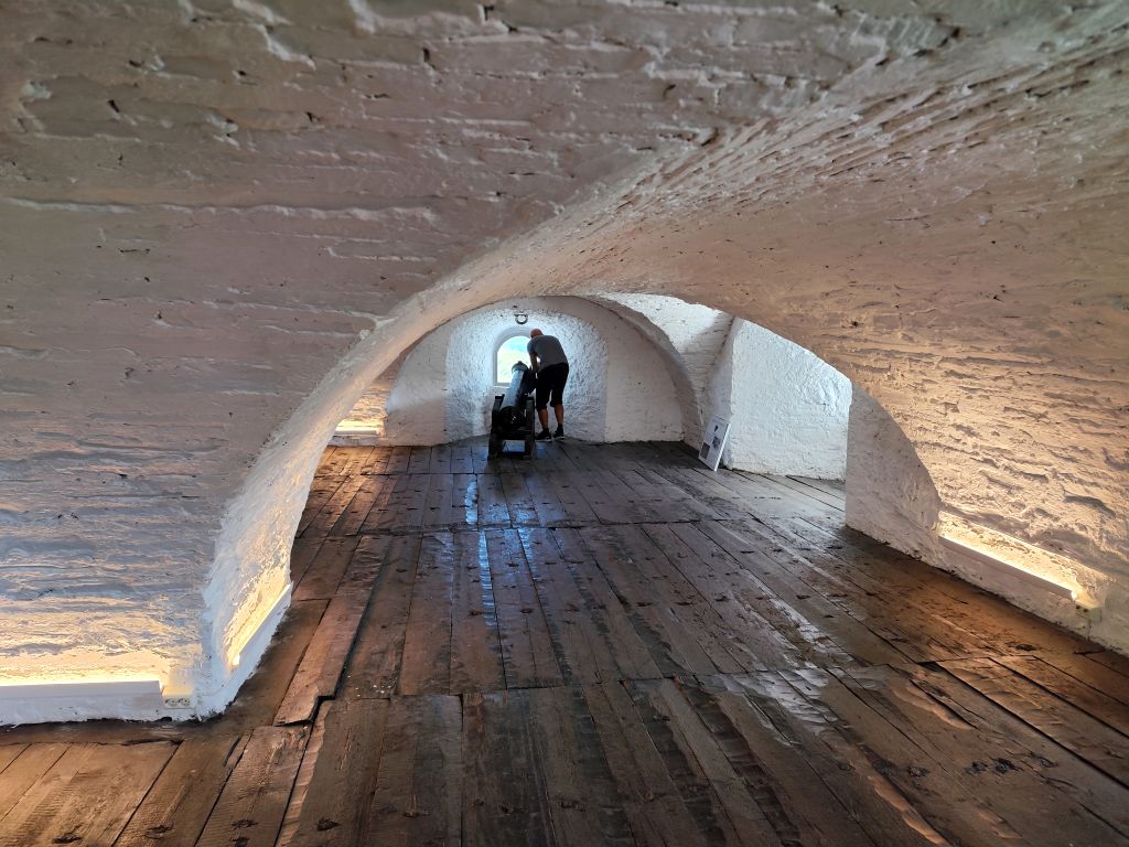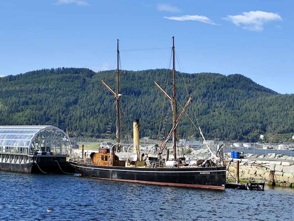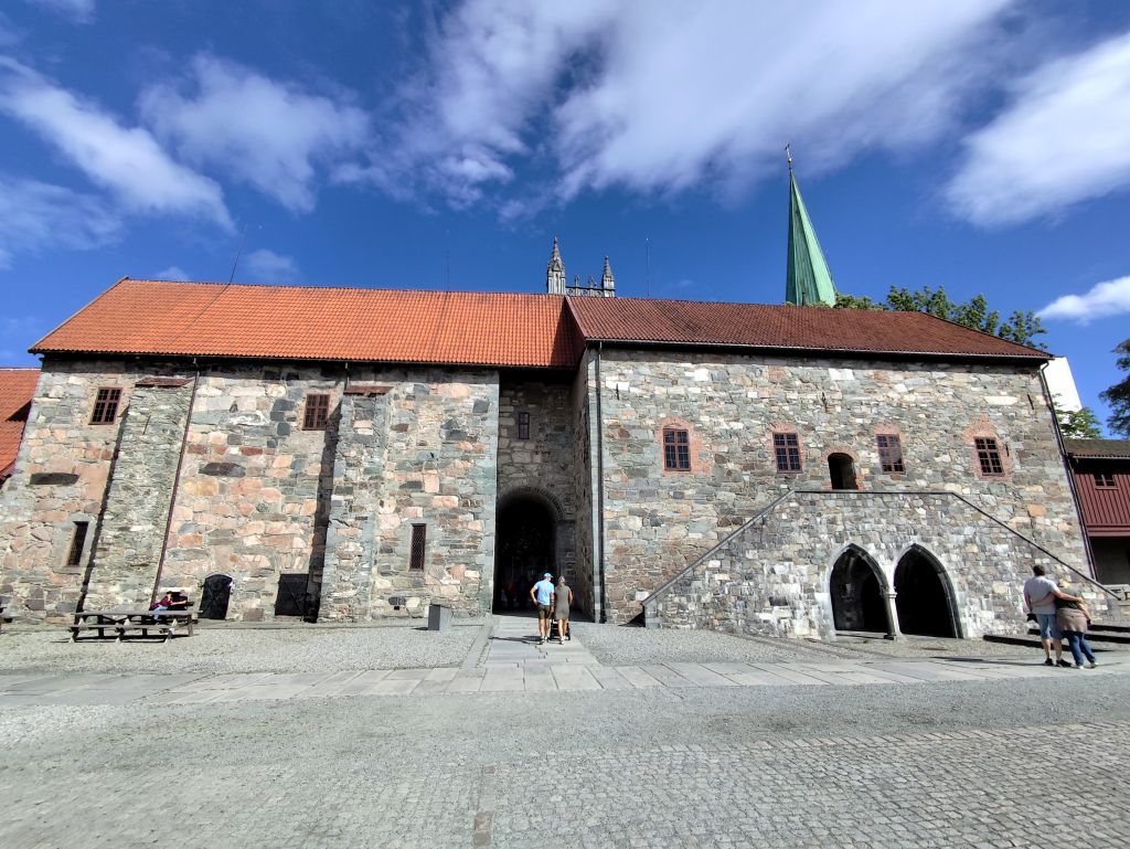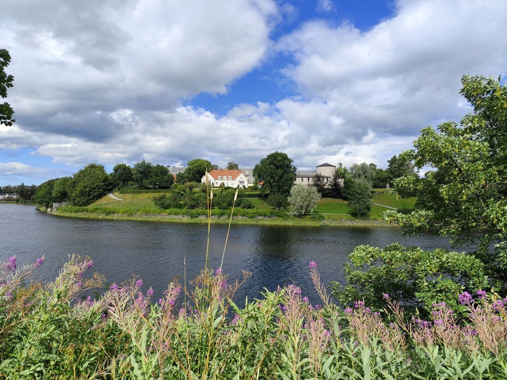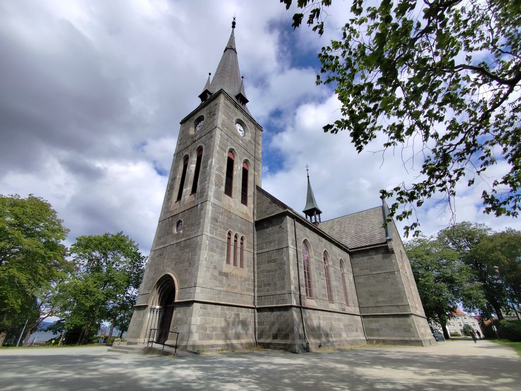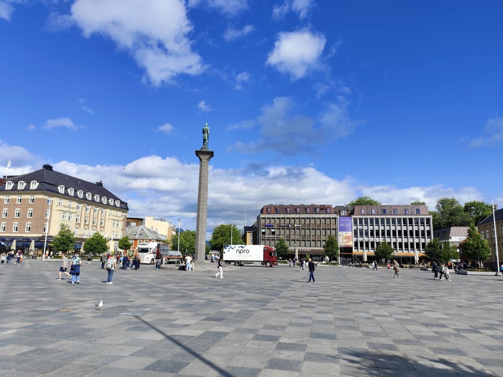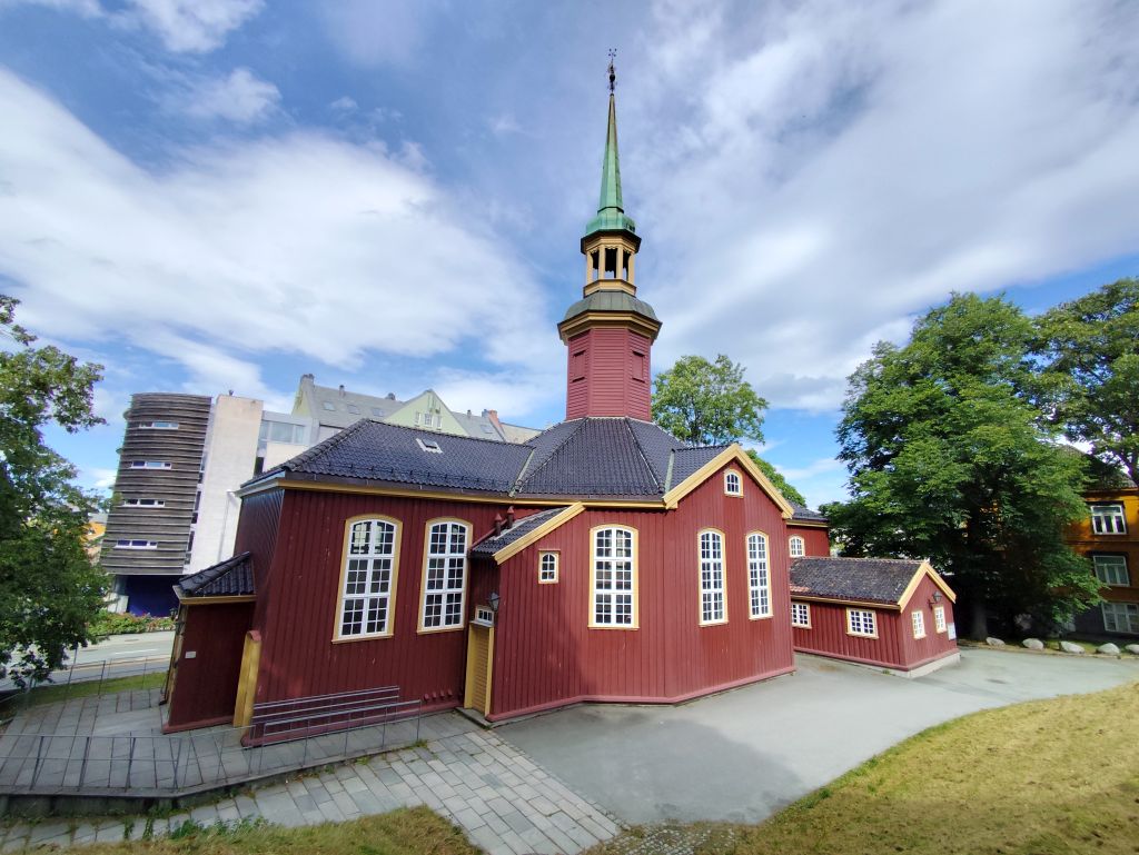 Stundenlang mache ich Buchungen für Lofoten. Das ist sehr schwierig, weil fast alles ausgebucht ist und ich nur noch wenige valable Unterkünfte finde. Dann laufe ich in die Stadt. Das Wetter ist wunderschön, der Himmel ist blau mit weissen Wölkchen, es ist warm. Ich beginne am Thaulowkaia, bestaune die Bryggene (die farbigen Lagerhäuser entlang der Nidelva), laufe durch die Nedre Bakklandet, die eine einzige Baustelle ist. Interessantes Detail: Die Bagger sind elektrisch angetrieben. Da die Strasse zur Gamle Bybro gesperrt ist, laufe ich zur Kristiansten Festung hoch und besuche sie gleich. Im Turm ist ein Museum untergebracht, das den Krieg zwischen den schwedischen und den norwegischen Truppen im 18. Jahrhundert zum Thema hat. Von hier aus gelange ich zum Øvre Bakklandet, wie der Nedre Bakklandet von farbigen Holzhäuschen gesäumt. Jetzt kann ich über die Gamle Bybro, eine ehemalige Ziehbrücke, laufen und gelange zum Nidarosdomen. Ich erschrecke schon, als hier ein riesiges Visitor Centre gebaut worden ist. Das „Mein Schiff“ hat wohl rund viertausend deutsche Touristen in die Stadt geschwemmt, von denen nur ganz viele hier anstehen. So verzichte ich auf einen Besuch. Gleich daneben ist der Erzbischofspalast, der diverse Museen birgt, die mich aber nicht weiter interessieren. Ich laufe quer durch die Stadt zum Torvet (Marktplatz), wo sich MacDonalds und Burger King die Hände geben. Unweit entfernt ist der Stiftsgården (ehemaliger Königspalast). Danach kommt die wie in fast allen besuchten Städten mit farbigen Regenschirmen dekorierte Thomas Angelis Gate und dann der Kanalen, wo unzählige Schiffe angebunden sind. Direkt am Kanalen liegt auch der Hauptbahnhof, den ich über die Jernbanebrua erreiche. Im Kanalen verankert ist auch die D/S Hansteen, die allem Anschein noch mit Dampf betrieben wird, aber nicht mehr mit Kohlen beheizt. Hinter dem Bahnhof kommt die Brattørkaia, wo an einem Steg das riesige Kreuzfahrtschiff „Mein Schiff“ vor Anker liegt. Ich habe starken Hunger und nehme das erstbeste Mittagessen, das ich finde. Im Supermarkt kaufe ich noch Wasser und Nüsse. Ich überquere die Nedelva zum TMV-Kaia, komme zur Bakke Kirke und laufe nochmals zu den schönen Bryggene. Ueber die Elgeseter Bru laufe ich ans andere Ufer nach Brendablikk, dann den Uferweg entlang zur Gangbrua, über die ich wieder zurücklaufe und zur Lien Kirke und Skansen komme. Für die Eisenbahn wurde eine monströse klappbare Brücke, die Skansen Bru gebaut, doch die neuere Fussgängerbrücke ist gar nicht mehr klappbar, so dass hier Segelschiffe nicht mehr durchkommen. Zurück am Brattørkaia bewundere ich noch die originelle Skulptur „What does the Fjord say?“, eine Kugel, wo verschiedene Trichter die Töne ins Innere leiten. Es ist jetzt vier Uhr, ich bin müde und der Himmel hat sich mit dunklen Gewitterwolken bedeckt, so dass ich zurück ins Hostel laufe.