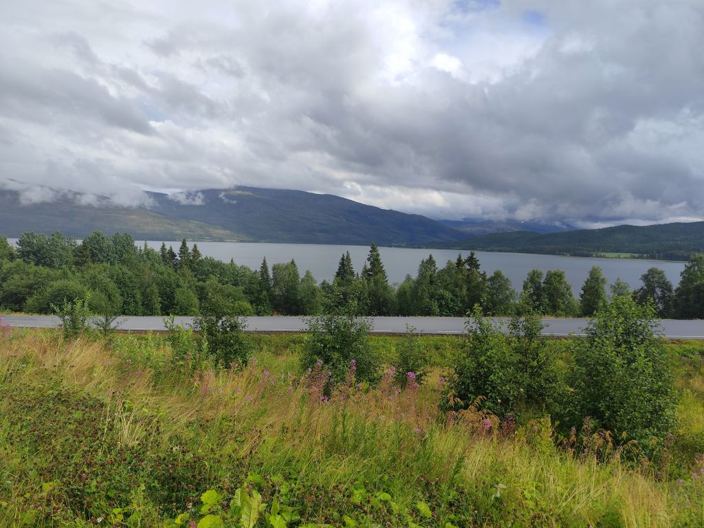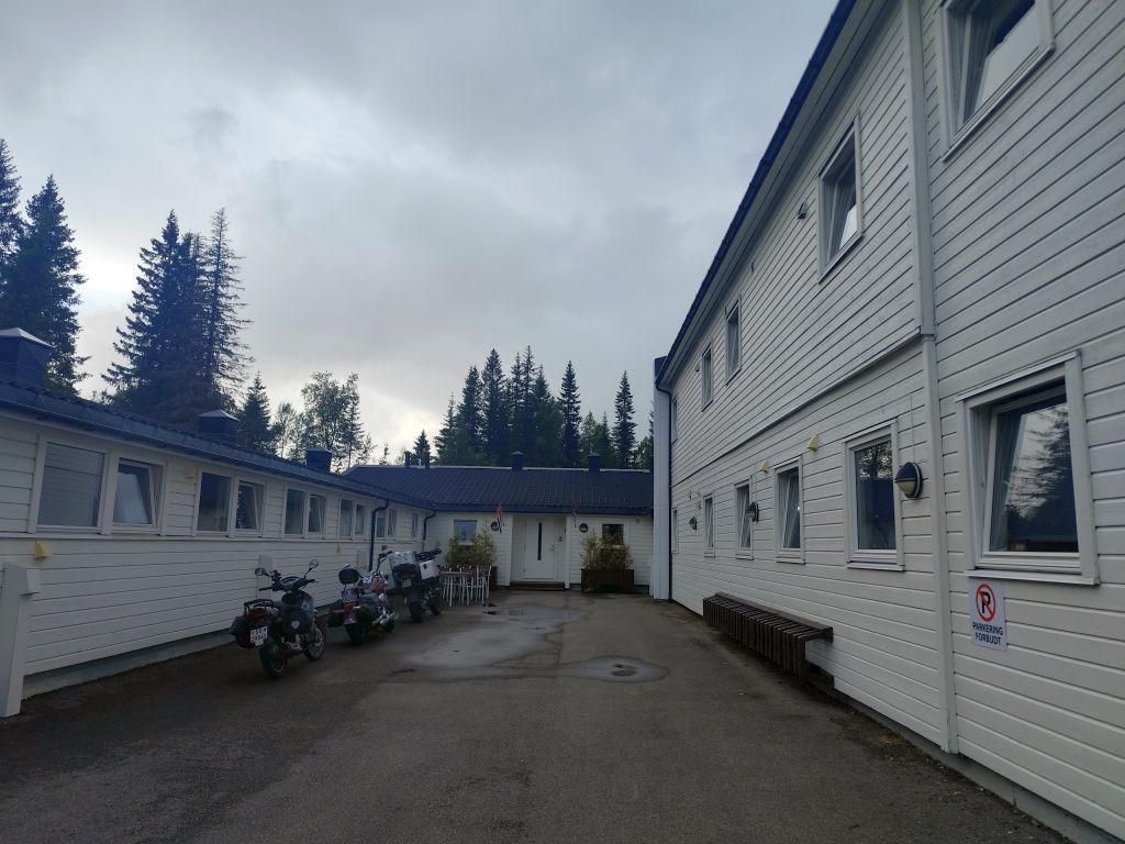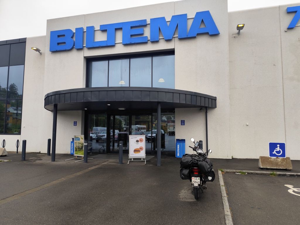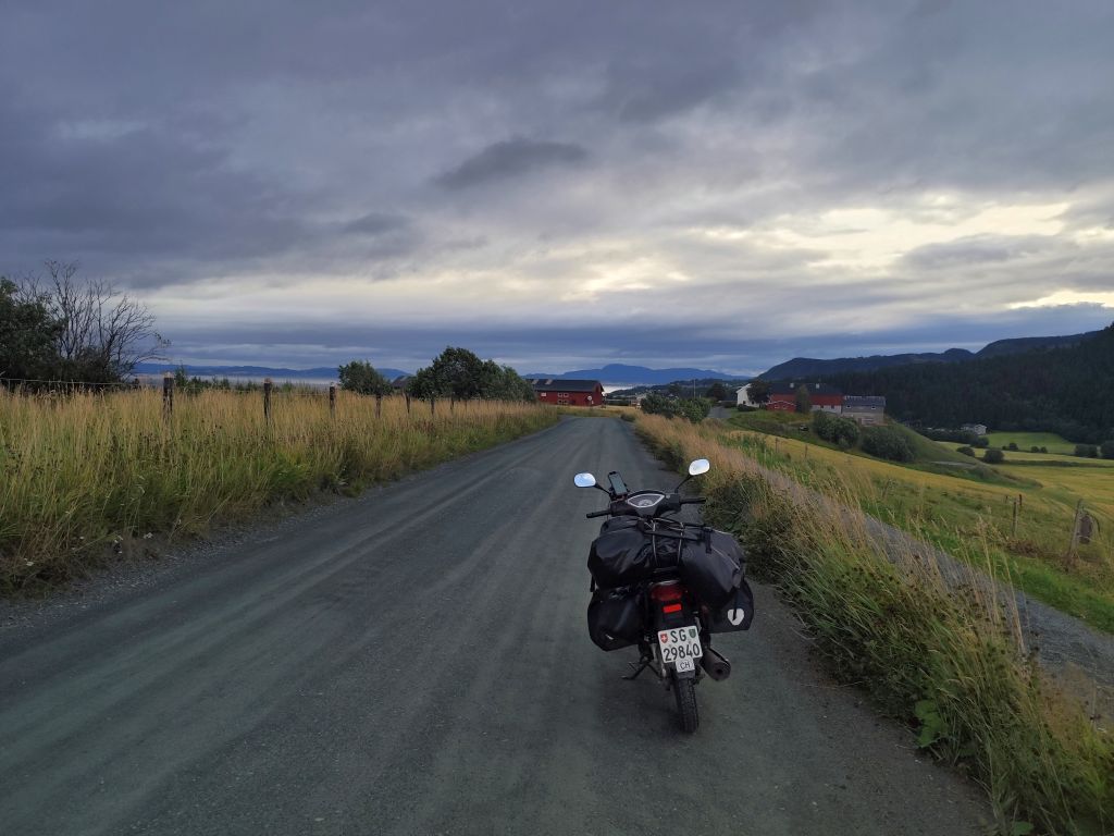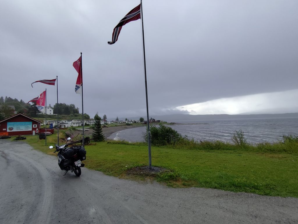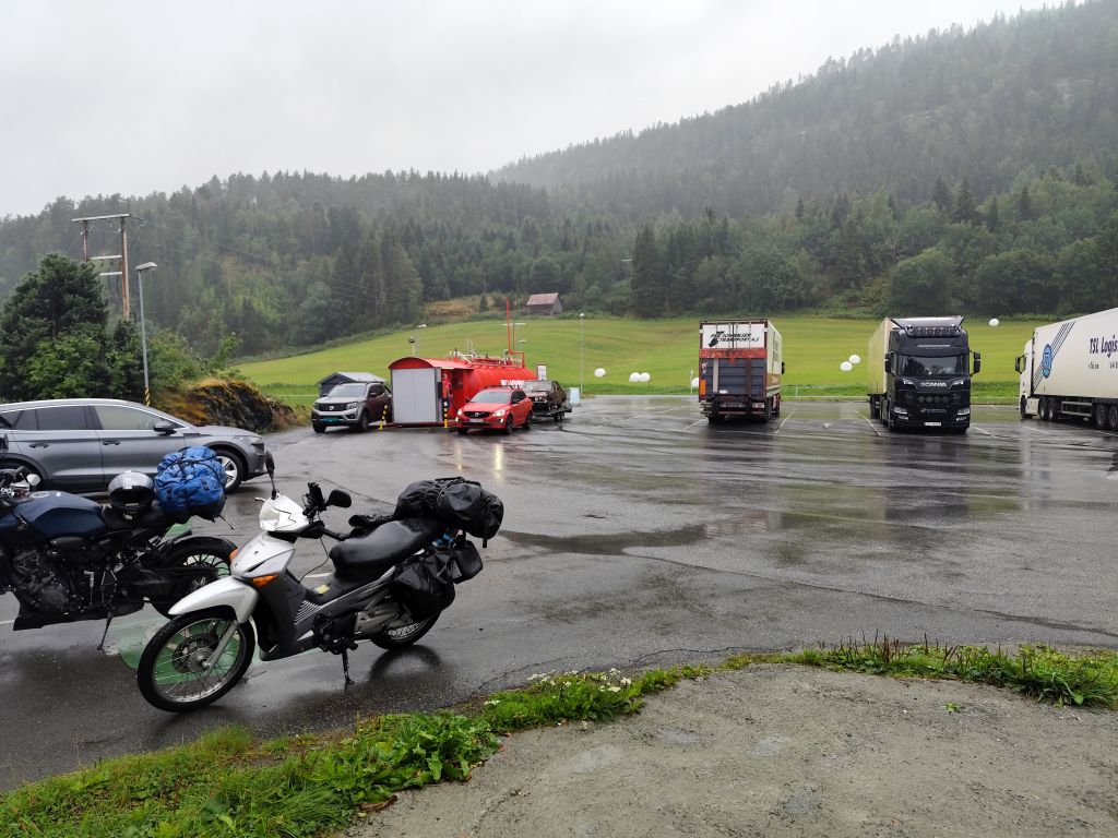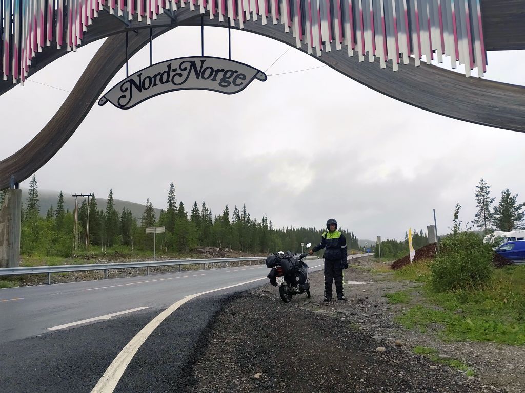 Schon gestern abend hatte es angefangen zu regnen, in der Nacht hat es geschüttet und heute morgen ist es ein Nieseln, richtig kalt und recht finster. Ich fahre im vollen Regenzeug ab. Vorerst ist der Regen recht fein. Um zehn Uhr bin ich in Steinkjer, wo ich bei der Biltema halte und Ausschau nach Motorradteilen halte – die gibt es aber nur in Schweden. Dafür nehme ich einen der berühmten Hot Dogs, die hier fast gratis sind. Das wärmt mich innerlich etwas auf. Ab hier regnet es heftig. Rasch bin ich, trotz Regenzeug, völlig durchnässt. In Trones tanke ich auf und kaufe mir einen riesigen Sack Salami zum Mittagessen – in diesen kleinen Supermärkten gibt es einfach nichts, was man so auf die Schnelle essen kann. Beim Nordlandsportalen halte ich an und mache trotz des heftigen Regens Fotos. 30 Kilometer vor Mosjøen hört der Regen auf. Mit dem allerletzten Tropfen Benzin komme ich in Mosjøen an – ich habe zwar noch meine zwei Kanister, aber ich mag nicht göötschen, und schon gar nicht im strömenden Regen, wo ich nachher noch Wasser im Benzin habe. Ich tanke auf und kaufe mir im Rema 1000 noch ein Abendessen. Dann mache mich an die letzten 100 Kilometer nach Mo i Rana. Es regnet wieder in Strömen. In Mo i Rana tanke ich nochmals auf und fahre durch die ganze sehr moderne Stadt bis zu meiner Unterkunft, dem Skillevollen Motel. Glücklicherweise hat es dort eine Gästeküche, so dass ich meine „Trondheim-Suppe“ aus der Dose aufwärmen und essen kann, was nach einem so kalten und nassen Tag und 508 gefahrenen Kilometern wunderbar ist.