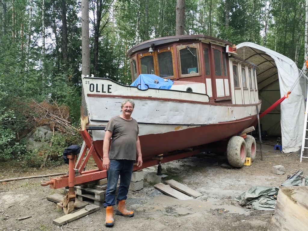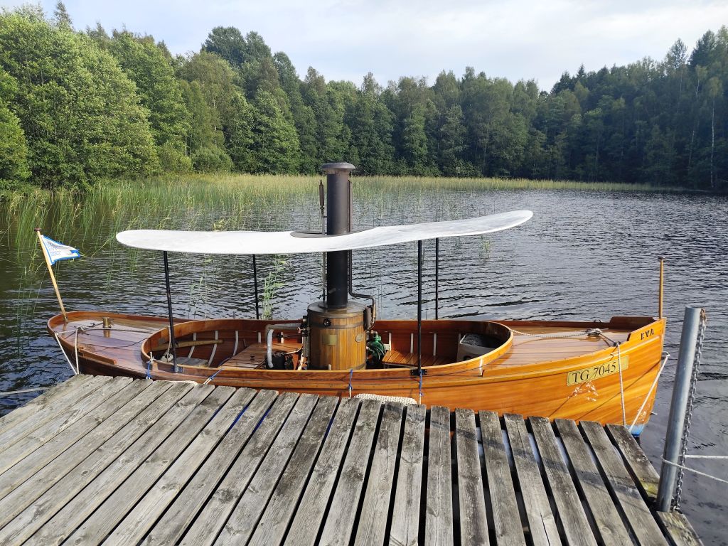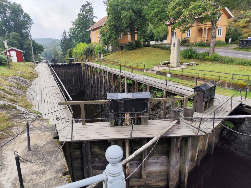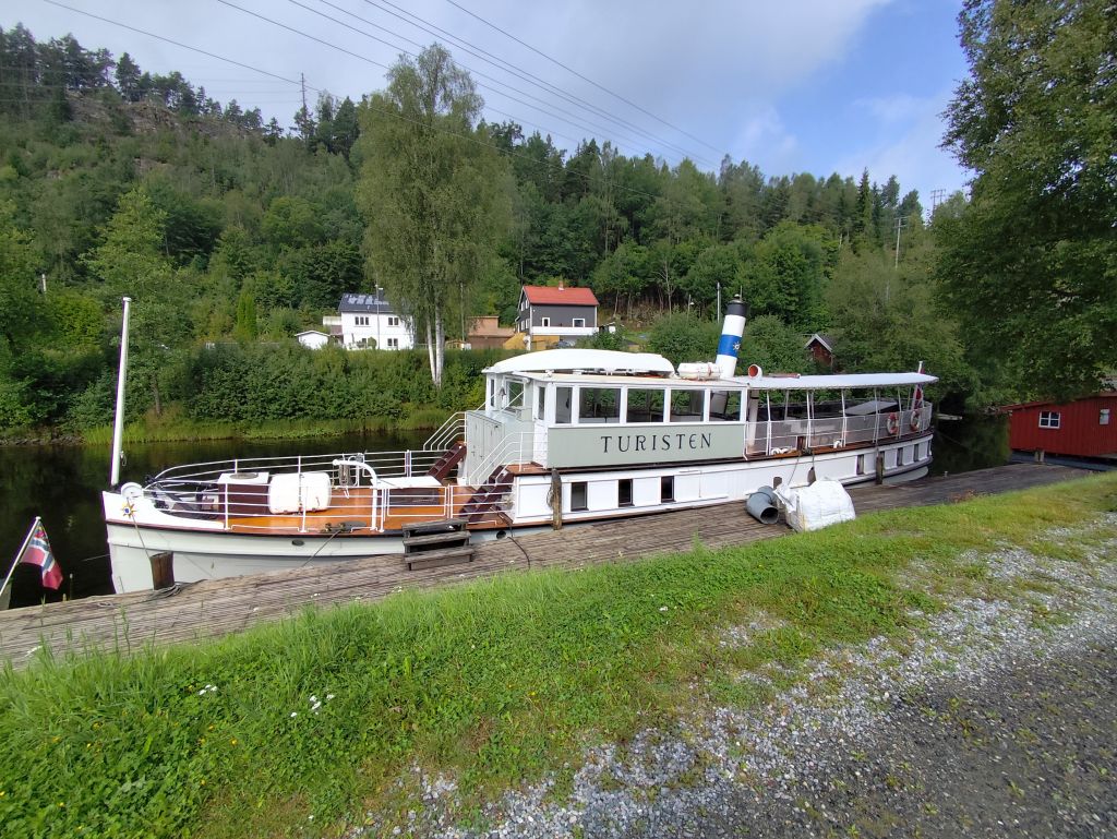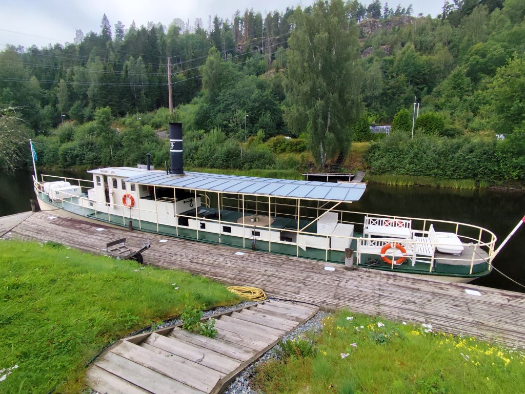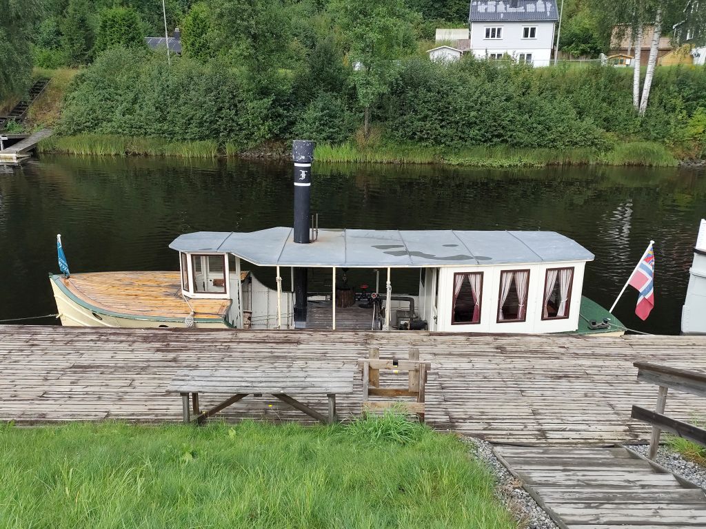 Am Abend kommt noch der Wohnungsinhaber, ein Pakistani. Mit ihm habe ich noch eine lange, angenehme Plauderei, bevor ich ins Bett gehe. Am Morgen lasse ich mir viel Zeit mit Duschen und Frühstück, denn ich will nicht zu früh in Bråtnäs ankommen, es sind ja nur 135 Kilometer. Der Himmel ist mit dunklen Gewitterwolken bedeckt, doch es regnet nicht. Ich fahre gemütlich bis Ørje, was sich auch positiv auf den Benzinverbrauch auswirkt, denn erst hier muss ich nachtanken. In Ørje fahre ich zu den Schleusen, zwei sehr tiefe Treppenschleusen, die den Øymarksjøen mit dem Rødenessjøen verbinden. Weiter unten ist das Kanalmuseum, wo drei Dampfer, d.h. zwei Dampfschiffe und ein Dampfboot am Steg dümpeln, nämlich die DS Turisten, die SL Hans und die DS Engebret Soot. Ich fahre weiter über die schwedische Grenze (völlig unproblematisch) nach Töcksfors und dem Lelång See entlang nach Bråtnäs, wo ich das Haus von Markus Toscan nach einmaligem Nachfragen leicht finde. Er empfängt mich herzlich, wir plaudern lange, er zeigt mir seine perfekt ausgestattete mechanische Werkstatt, sein Dampfschiffprojekt DS Olle und seine Feldbahn, dann fahren wir mit dem Ruderboot zu seiner Insel, die er Ångaholmen (Dampfinselchen) nennt. Am Abend kochen wir zusammen Huhn mit Kartoffeln, eine Riesenportion, die wir zu zweit restlos aufessen. Ich schlafe in einem Häuschen auf seinem riesigen Grundstück.